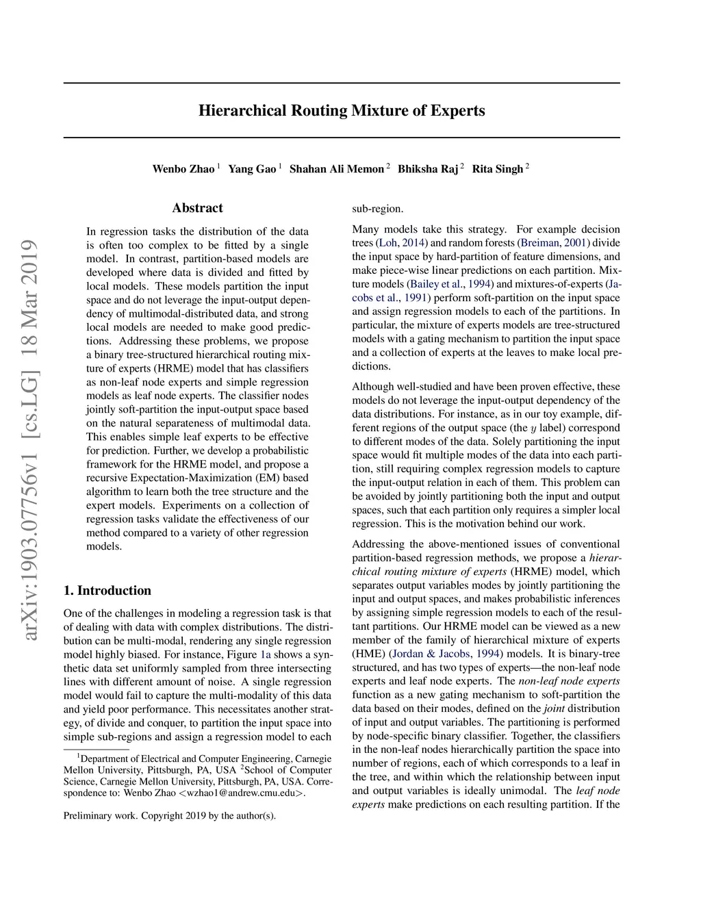 In regression tasks the distribution of the data is often too complex to be fitted by a single model. In contrast, partition-based models are developed where data is divided and fitted by local models. These models partition the input space and do not leverage the input-output dependency of multimodal-distributed data, and strong local models are needed to make good predictions. Addressing these problems, we propose a binary tree-structured hierarchical routing mixture of experts (HRME) model that has classifiers as non-leaf node experts and simple regression models as leaf node experts. The classifier nodes jointly soft-partition the input-output space based on the natural separateness of multimodal data. This enables simple leaf experts to be effective for prediction. Further, we develop a probabilistic framework for the HRME model, and propose a recursive Expectation-Maximization (EM) based algorithm to learn both the tree structure and the expert models. Experiments on a collection of regression tasks validate the effectiveness of our method compared to a variety of other regression models.