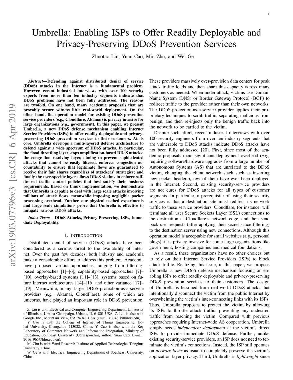 Defending against distributed denial of service (DDoS) attacks in the Internet is a fundamental problem. However, recent industrial interviews with over 100 security experts from more than ten industry segments indicate that DDoS problems have not been fully addressed. The reasons are twofold. On one hand, many academic proposals that are provably secure witness little real-world deployment. On the other hand, the operation model for existing DDoS-prevention service providers (e.g., Cloudflare, Akamai) is privacy invasive for large organizations (e.g., government). In this paper, we present Umbrella, a new DDoS defense mechanism enabling Internet Service Providers (ISPs) to offer readily deployable and privacy-preserving DDoS prevention services to their customers. At its core, Umbrella develops a multi-layered defense architecture to defend against a wide spectrum of DDoS attacks. In particular, the flood throttling layer stops amplification-based DDoS attacks; the congestion resolving layer, aiming to prevent sophisticated attacks that cannot be easily filtered, enforces congestion accountability to ensure that legitimate flows are guaranteed to receive their fair shares regardless of attackers' strategies; and finally the userspecific layer allows DDoS victims to enforce self-desired traffic control policies that best satisfy their business requirements. Based on Linux implementation, we demonstrate that Umbrella is capable to deal with large scale attacks involving millions of attack flows, meanwhile imposing negligible packet processing overhead. Further, our physical testbed experiments and large scale simulations prove that Umbrella is effective to mitigate various DDoS attacks.