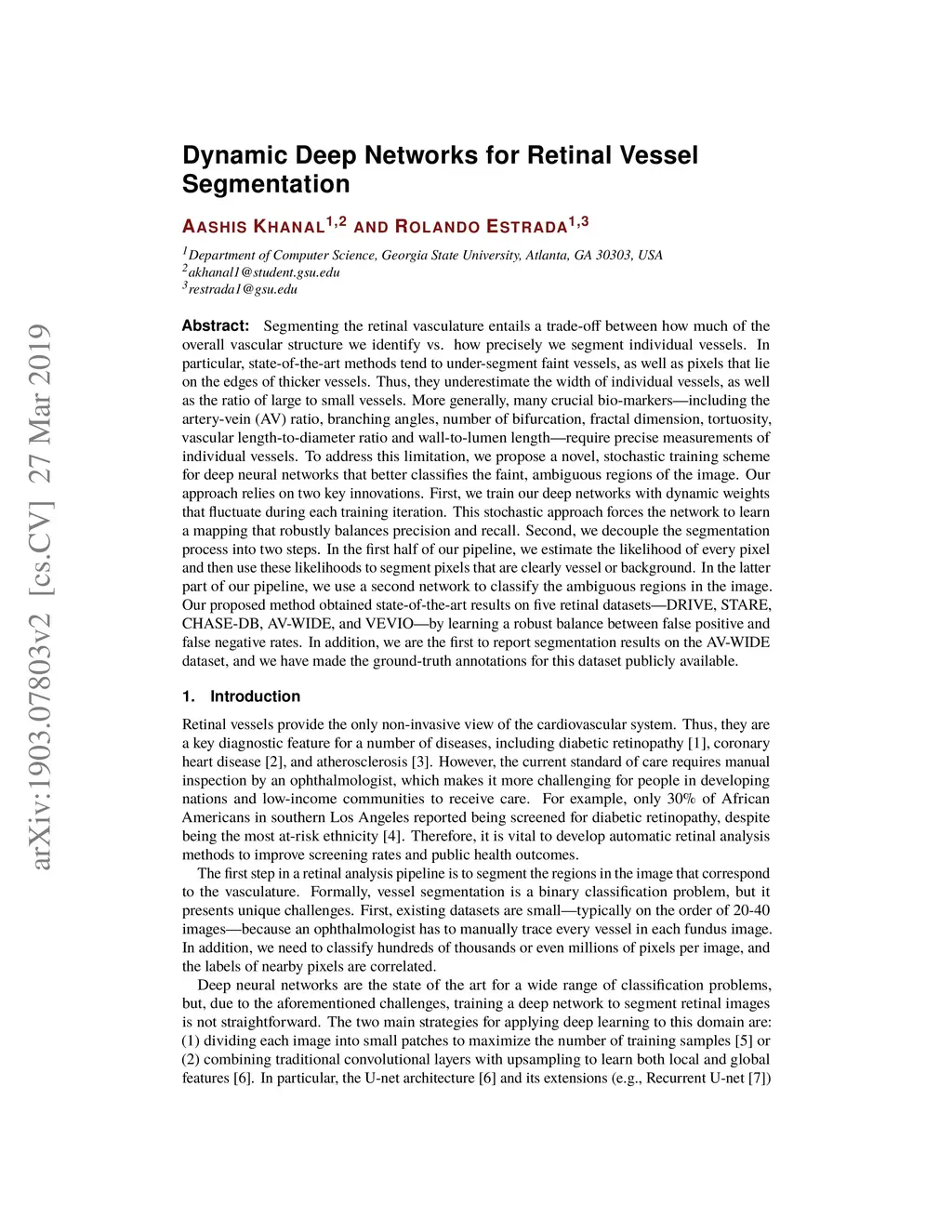 Segmenting the retinal vasculature entails a trade-off between how much of the overall vascular structure we identify vs. how precisely we segment individual vessels. In particular, state-of-the-art methods tend to under-segment faint vessels, as well as pixels that lie on the edges of thicker vessels. Thus, they underestimate the width of individual vessels, as well as the ratio of large to small vessels. More generally, many crucial bio-markers---including the artery-vein (AV) ratio, branching angles, number of bifurcation, fractal dimension, tortuosity, vascular length-to-diameter ratio and wall-to-lumen length---require precise measurements of individual vessels. To address this limitation, we propose a novel, stochastic training scheme for deep neural networks that better classifies the faint, ambiguous regions of the image. Our approach relies on two key innovations. First, we train our deep networks with dynamic weights that fluctuate during each training iteration. This stochastic approach forces the network to learn a mapping that robustly balances precision and recall. Second, we decouple the segmentation process into two steps. In the first half of our pipeline, we estimate the likelihood of every pixel and then use these likelihoods to segment pixels that are clearly vessel or background. In the latter part of our pipeline, we use a second network to classify the ambiguous regions in the image. Our proposed method obtained state-of-the-art results on five retinal datasets---DRIVE, STARE, CHASE-DB, AV-WIDE, and VEVIO---by learning a robust balance between false positive and false negative rates. In addition, we are the first to report segmentation results on the AV-WIDE dataset, and we have made the ground-truth annotations for this dataset publicly available.