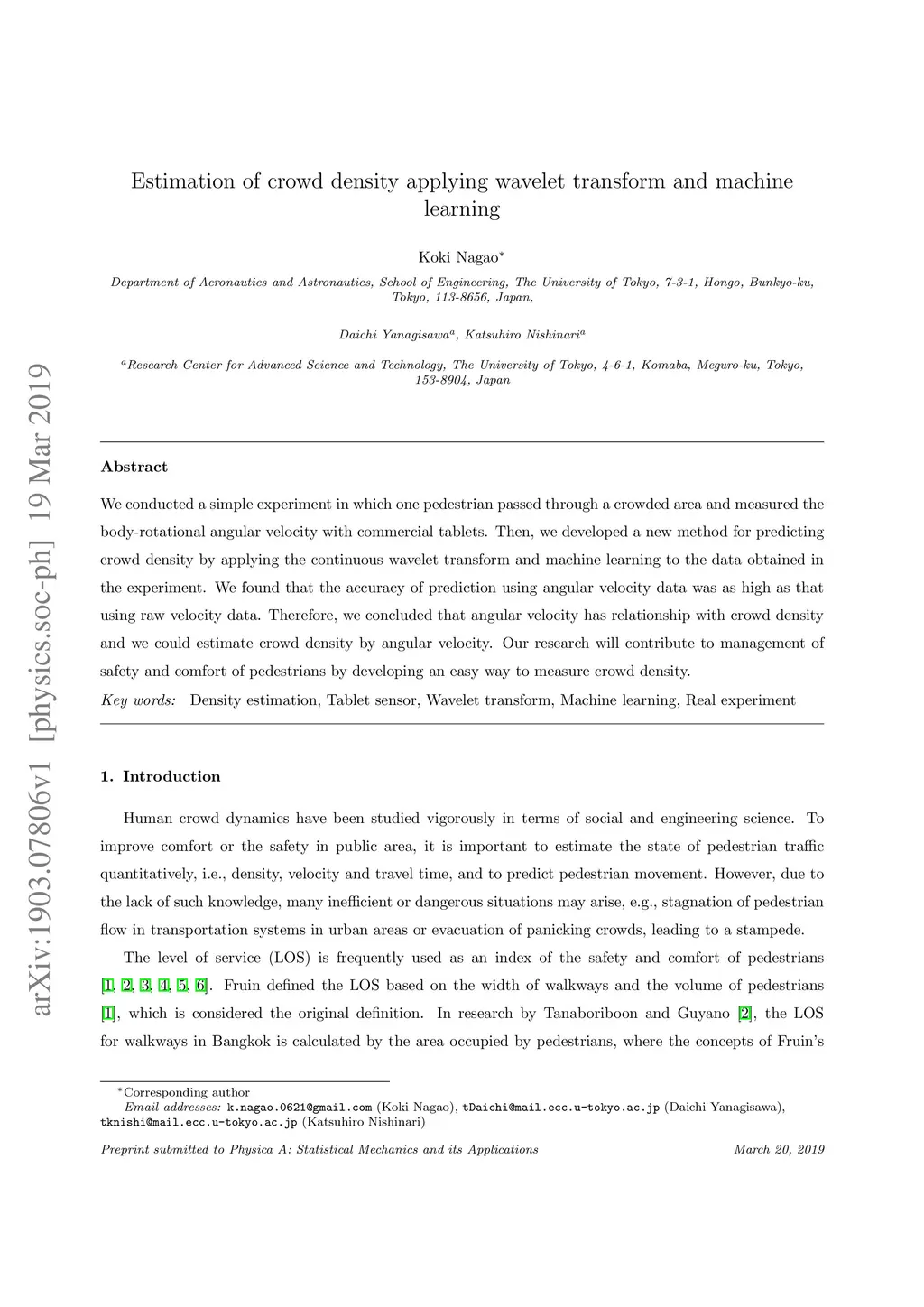 We conducted a simple experiment in which one pedestrian passed through a crowded area and measured the body-rotational angular velocity with commercial tablets. Then, we developed a new method for predicting crowd density by applying the continuous wavelet transform and machine learning to the data obtained in the experiment. We found that the accuracy of prediction using angular velocity data was as high as that using raw velocity data. Therefore, we concluded that angular velocity has relationship with crowd density and we could estimate crowd density by angular velocity. Our research will contribute to management of safety and comfort of pedestrians by developing an easy way to measure crowd density.
