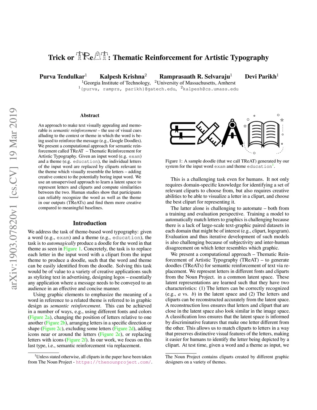 An approach to make text visually appealing and memorable is semantic reinforcement - the use of visual cues alluding to the context or theme in which the word is being used to reinforce the message (e.g., Google Doodles). We present a computational approach for semantic reinforcement called TReAT - Thematic Reinforcement for Artistic Typography. Given an input word (e.g. exam) and a theme (e.g. education), the individual letters of the input word are replaced by cliparts relevant to the theme which visually resemble the letters - adding creative context to the potentially boring input word. We use an unsupervised approach to learn a latent space to represent letters and cliparts and compute similarities between the two. Human studies show that participants can reliably recognize the word as well as the theme in our outputs (TReATs) and find them more creative compared to meaningful baselines.