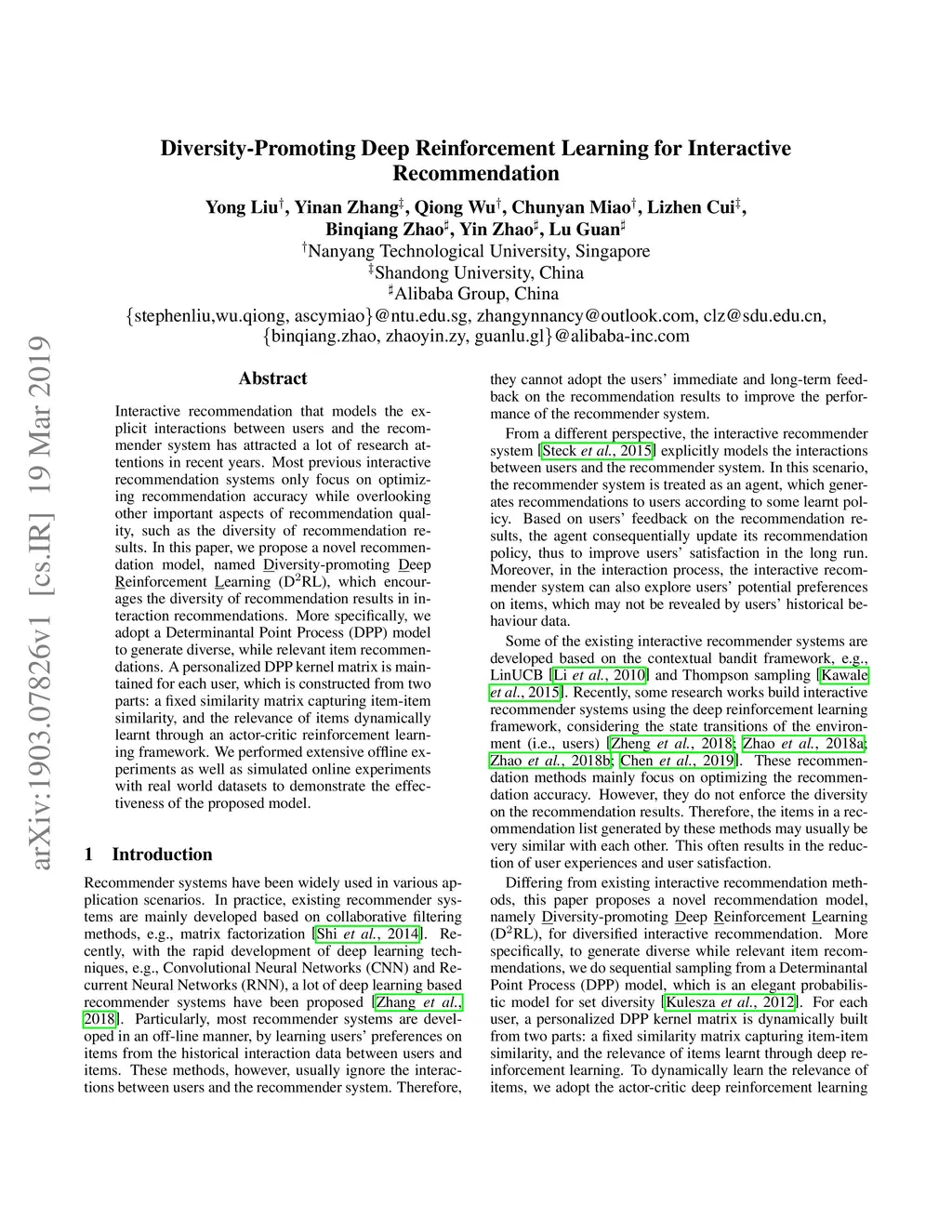Interactive recommendation that models the explicit interactions between users and the recommender system has attracted a lot of research attentions in recent years. Most previous interactive recommendation systems only focus on optimizing recommendation accuracy while overlooking other important aspects of recommendation quality, such as the diversity of recommendation results. In this paper, we propose a novel recommendation model, named \underline{D}iversity-promoting \underline{D}eep \underline{R}einforcement \underline{L}earning (DRL), which encourages the diversity of recommendation results in interaction recommendations. More specifically, we adopt a Determinantal Point Process (DPP) model to generate diverse, while relevant item recommendations. A personalized DPP kernel matrix is maintained for each user, which is constructed from two parts: a fixed similarity matrix capturing item-item similarity, and the relevance of items dynamically learnt through an actor-critic reinforcement learning framework. We performed extensive offline experiments as well as simulated online experiments with real world datasets to demonstrate the effectiveness of the proposed model.