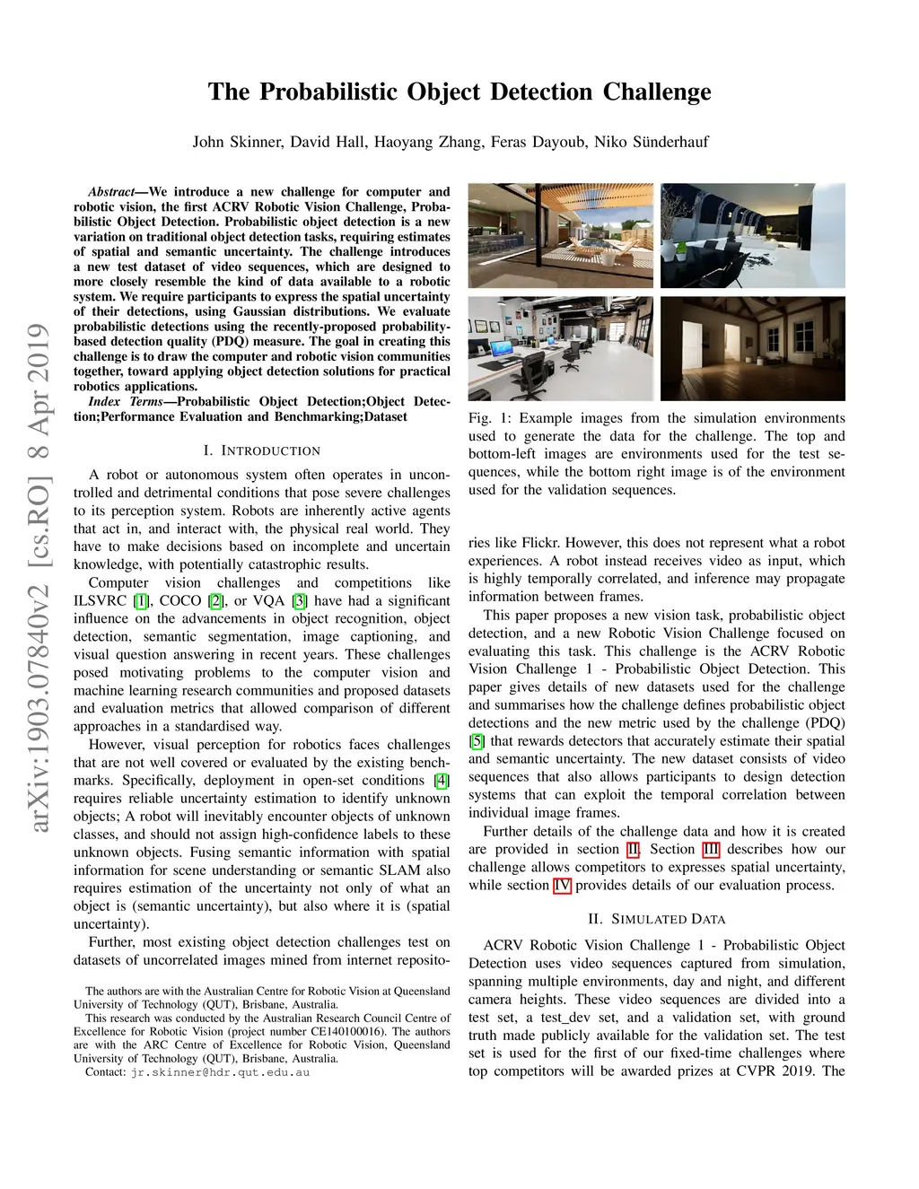 We introduce a new challenge for computer and robotic vision, the first ACRV Robotic Vision Challenge, Probabilistic Object Detection. Probabilistic object detection is a new variation on traditional object detection tasks, requiring estimates of spatial and semantic uncertainty. We extend the traditional bounding box format of object detection to express spatial uncertainty using gaussian distributions for the box corners. The challenge introduces a new test dataset of video sequences, which are designed to more closely resemble the kind of data available to a robotic system. We evaluate probabilistic detections using a new probability-based detection quality (PDQ) measure. The goal in creating this challenge is to draw the computer and robotic vision communities together, toward applying object detection solutions for practical robotics applications.