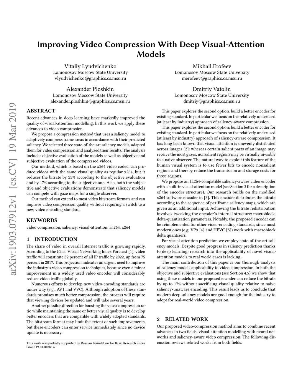 Recent advances in deep learning have markedly improved the quality of visual-attention modelling. In this work we apply these advances to video compression. We propose a compression method that uses a saliency model to adaptively compress frame areas in accordance with their predicted saliency. We selected three state-of-the-art saliency models, adapted them for video compression and analyzed their results. The analysis includes objective evaluation of the models as well as objective and subjective evaluation of the compressed videos. Our method, which is based on the x264 video codec, can produce videos with the same visual quality as regular x264, but it reduces the bitrate by 25% according to the objective evaluation and by 17% according to the subjective one. Also, both the subjective and objective evaluations demonstrate that saliency models can compete with gaze maps for a single observer. Our method can extend to most video bitstream formats and can improve video compression quality without requiring a switch to a new video encoding standard.