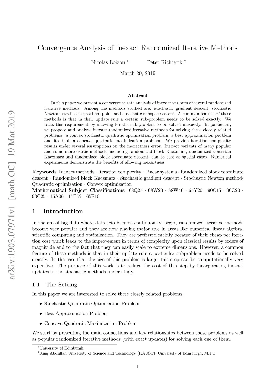 In this paper we present a convergence rate analysis of inexact variants of several randomized iterative methods. Among the methods studied are: stochastic gradient descent, stochastic Newton, stochastic proximal point and stochastic subspace ascent. A common feature of these methods is that in their update rule a certain sub-problem needs to be solved exactly. We relax this requirement by allowing for the sub-problem to be solved inexactly. In particular, we propose and analyze inexact randomized iterative methods for solving three closely related problems: a convex stochastic quadratic optimization problem, a best approximation problem and its dual, a concave quadratic maximization problem. We provide iteration complexity results under several assumptions on the inexactness error. Inexact variants of many popular and some more exotic methods, including randomized block Kaczmarz, randomized Gaussian Kaczmarz and randomized block coordinate descent, can be cast as special cases. Numerical experiments demonstrate the benefits of allowing inexactness.