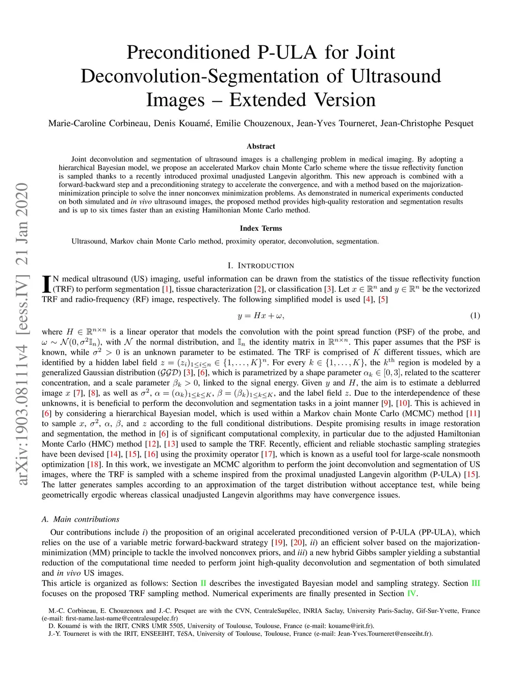 Preconditioned P-ULA for Joint Deconvolution-Segmentation of Ultrasound