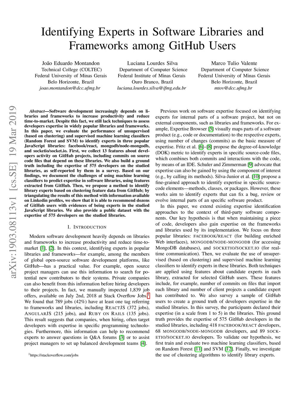 Software development increasingly depends on libraries and frameworks to increase productivity and reduce time-to-market. Despite this fact, we still lack techniques to assess developers expertise in widely popular libraries and frameworks. In this paper, we evaluate the performance of unsupervised (based on clustering) and supervised machine learning classifiers (Random Forest and SVM) to identify experts in three popular JavaScript libraries: facebook/react, mongodb/node-mongodb, and socketio/socket.io. First, we collect 13 features about developers activity on GitHub projects, including commits on source code files that depend on these libraries. We also build a ground truth including the expertise of 575 developers on the studied libraries, as self-reported by them in a survey. Based on our findings, we document the challenges of using machine learning classifiers to predict expertise in software libraries, using features extracted from GitHub. Then, we propose a method to identify library experts based on clustering feature data from GitHub; by triangulating the results of this method with information available on Linkedin profiles, we show that it is able to recommend dozens of GitHub users with evidences of being experts in the studied JavaScript libraries. We also provide a public dataset with the expertise of 575 developers on the studied libraries.