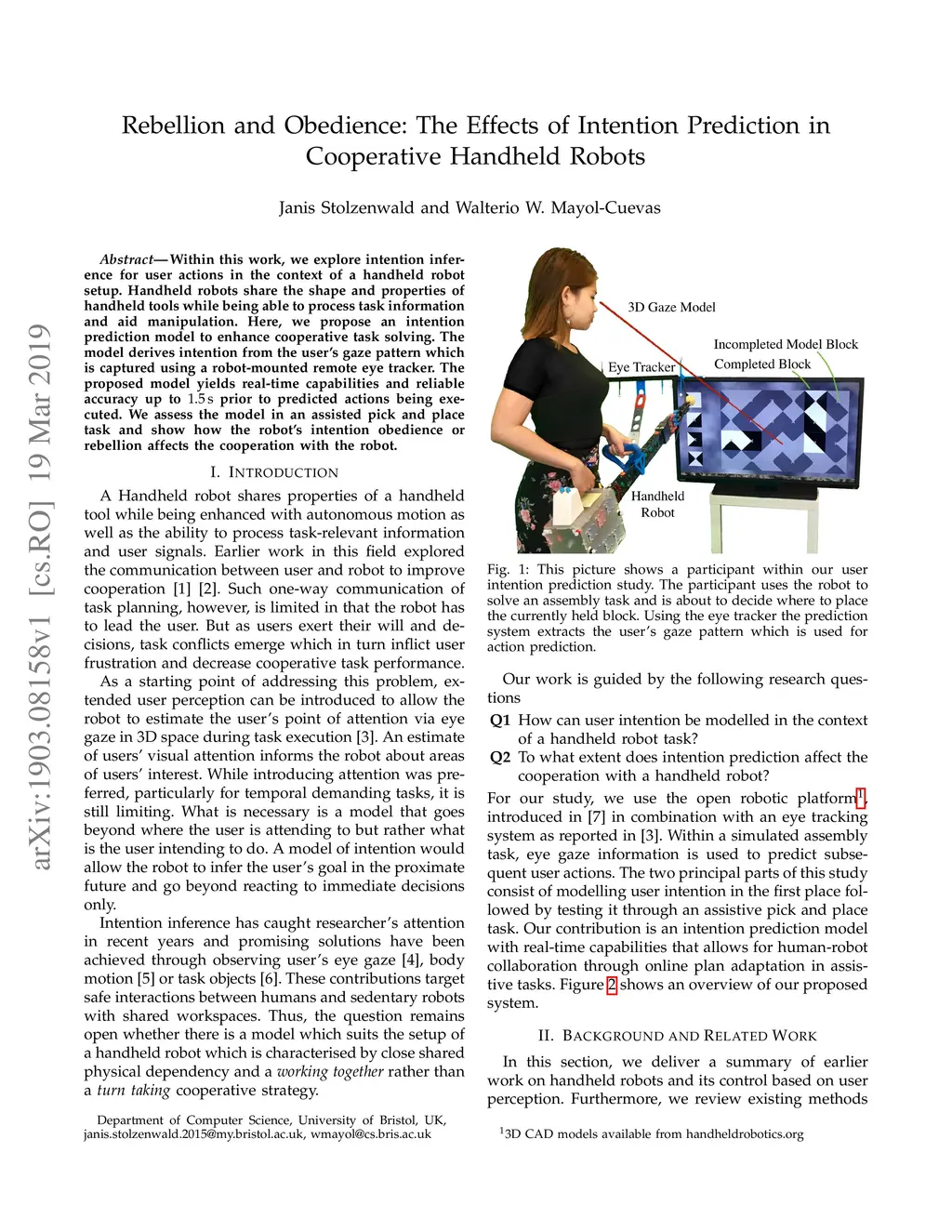 Within this work, we explore intention inference for user actions in the context of a handheld robot setup. Handheld robots share the shape and properties of handheld tools while being able to process task information and aid manipulation. Here, we propose an intention prediction model to enhance cooperative task solving. The model derives intention from the user's gaze pattern which is captured using a robot-mounted remote eye tracker. The proposed model yields real-time capabilities and reliable accuracy up to 1.5s prior to predicted actions being executed. We assess the model in an assisted pick and place task and show how the robot's intention obedience or rebellion affects the cooperation with the robot.