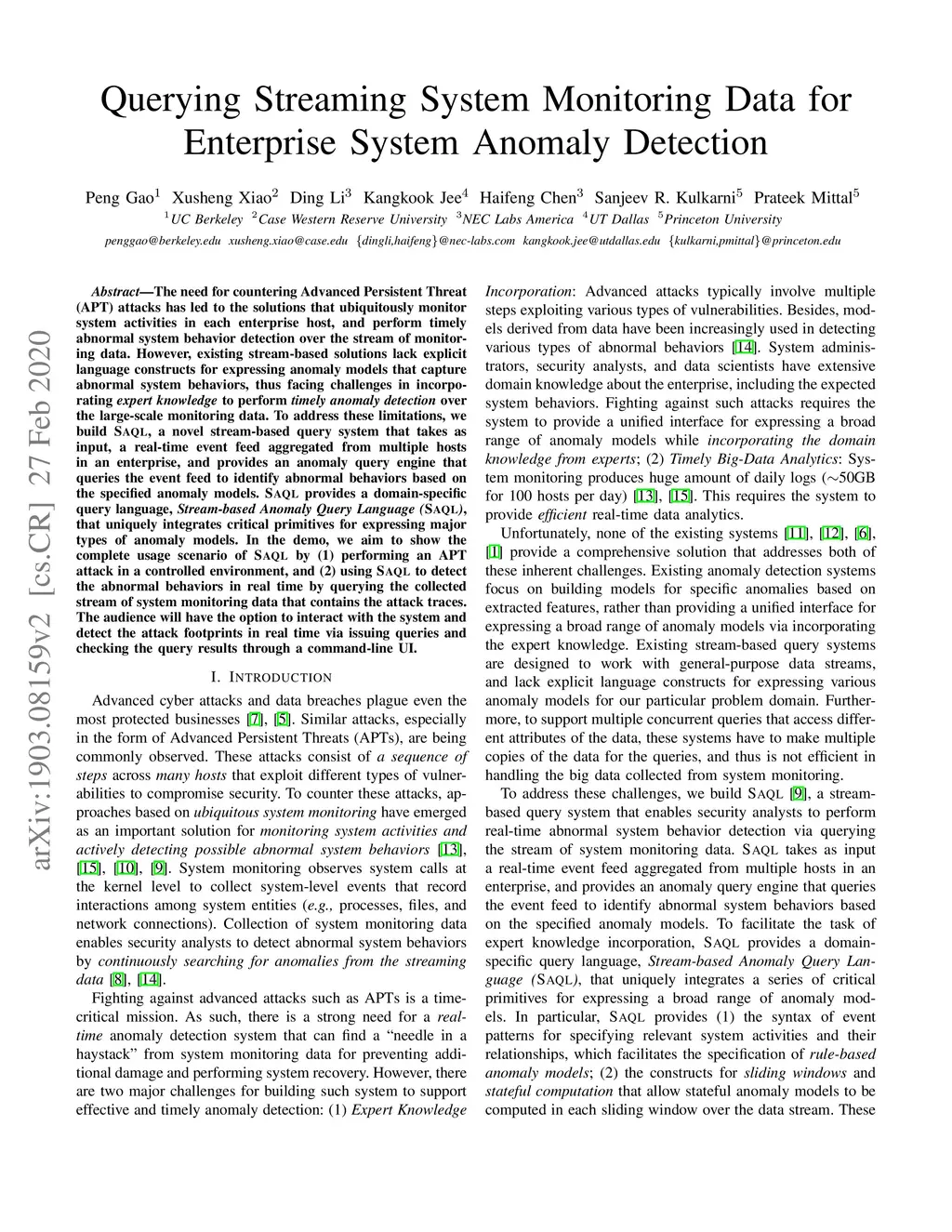 The need for countering Advanced Persistent Threat (APT) attacks has led to the solutions that ubiquitously monitor system activities in each enterprise host, and perform timely abnormal system behavior detection over the stream of monitoring data. However, existing stream-based solutions lack explicit language constructs for expressing anomaly models that capture abnormal system behaviors, thus facing challenges in incorporating expert knowledge to perform timely anomaly detection over the large-scale monitoring data. To address these limitations, we build SAQL, a novel stream-based query system that takes as input, a real-time event feed aggregated from multiple hosts in an enterprise, and provides an anomaly query engine that queries the event feed to identify abnormal behaviors based on the specified anomaly models. SAQL provides a domain-specific query language, Stream-based Anomaly Query Language (SAQL), that uniquely integrates critical primitives for expressing major types of anomaly models. In the demo, we aim to show the complete usage scenario of SAQL by (1) performing an APT attack in a controlled environment, and (2) using SAQL to detect the abnormal behaviors in real time by querying the collected stream of system monitoring data that contains the attack traces. The audience will have the option to interact with the system and detect the attack footprints in real time via issuing queries and checking the query results through a command-line UI.
