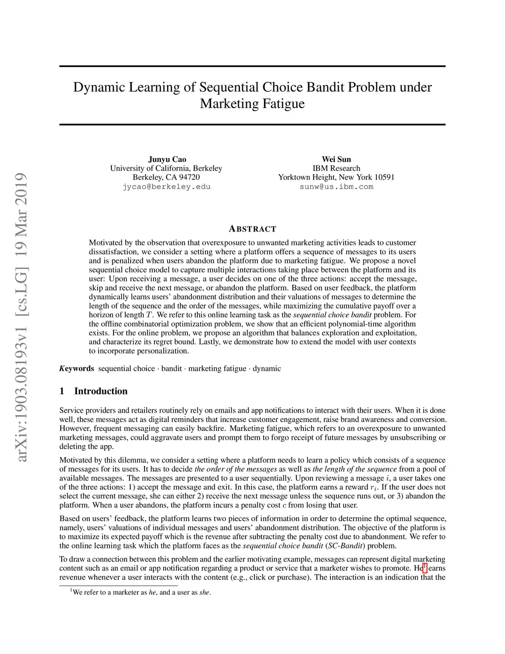 Motivated by the observation that overexposure to unwanted marketing activities leads to customer dissatisfaction, we consider a setting where a platform offers a sequence of messages to its users and is penalized when users abandon the platform due to marketing fatigue. We propose a novel sequential choice model to capture multiple interactions taking place between the platform and its user: Upon receiving a message, a user decides on one of the three actions: accept the message, skip and receive the next message, or abandon the platform. Based on user feedback, the platform dynamically learns users' abandonment distribution and their valuations of messages to determine the length of the sequence and the order of the messages, while maximizing the cumulative payoff over a horizon of length T. We refer to this online learning task as the sequential choice bandit problem. For the offline combinatorial optimization problem, we show that an efficient polynomial-time algorithm exists. For the online problem, we propose an algorithm that balances exploration and exploitation, and characterize its regret bound. Lastly, we demonstrate how to extend the model with user contexts to incorporate personalization.