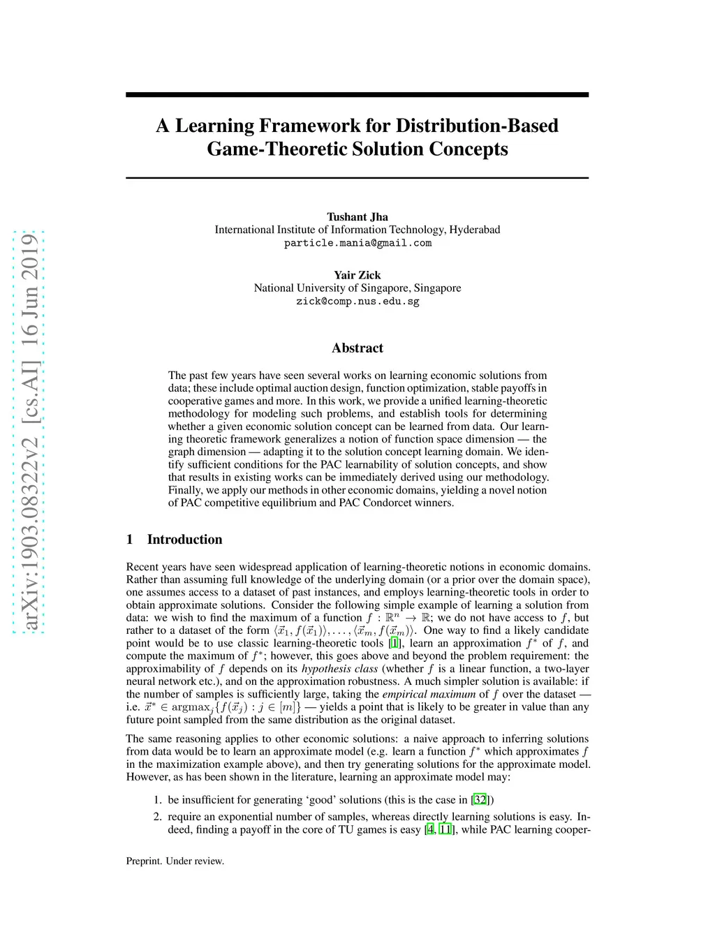 The past few years have seen several works on learning economic solutions from data; these include optimal auction design, function optimization, stable payoffs in cooperative games and more. In this work, we provide a unified learning-theoretic methodology for modeling such problems, and establish tools for determining whether a given economic solution concept can be learned from data. Our learning theoretic framework generalizes a notion of function space dimension -- the graph dimension -- adapting it to the solution concept learning domain. We identify sufficient conditions for the PAC learnability of solution concepts, and show that results in existing works can be immediately derived using our methodology. Finally, we apply our methods in other economic domains, yielding a novel notion of PAC competitive equilibrium and PAC Condorcet winners.