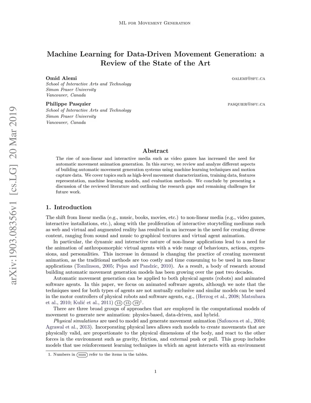 Machine Learning for Data-Driven Movement Generation: a Review of the