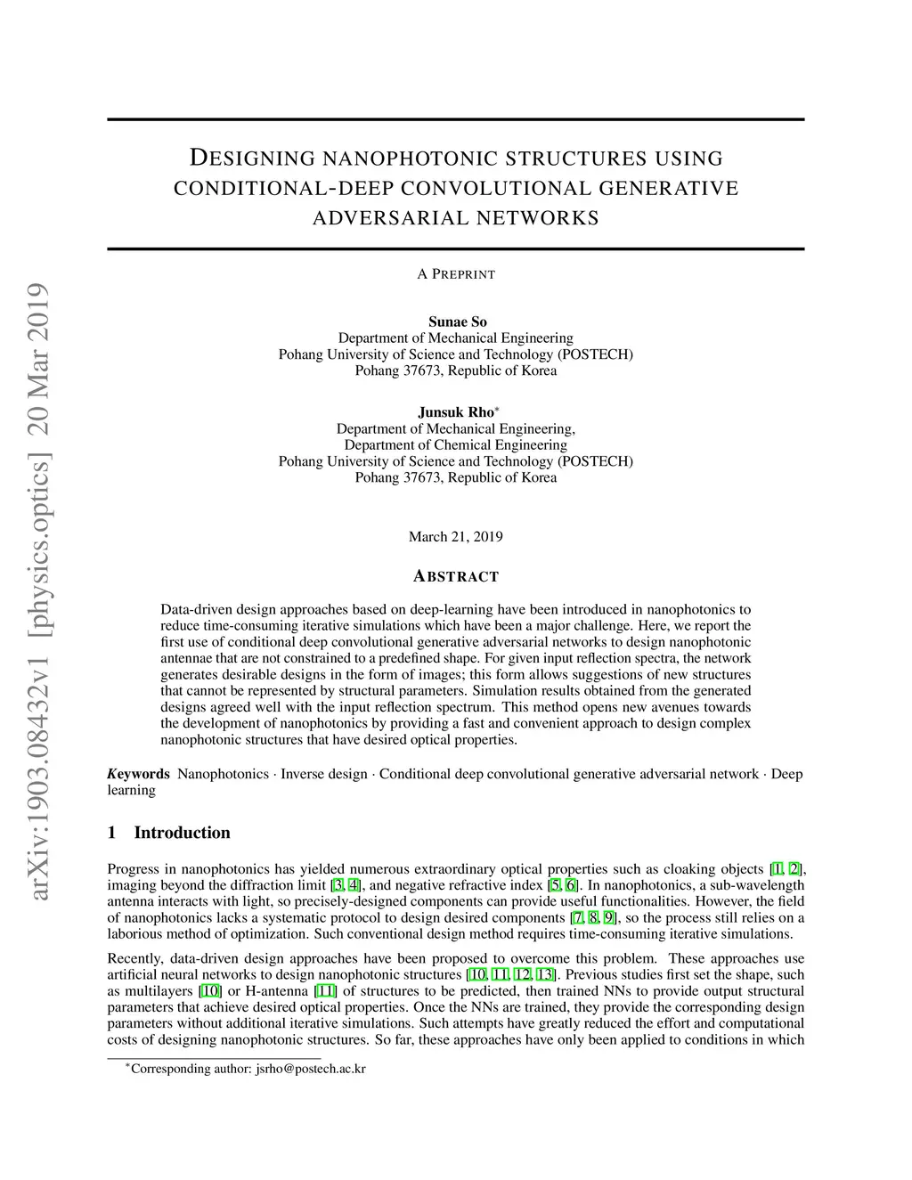 Data-driven design approaches based on deep-learning have been introduced in nanophotonics to reduce time-consuming iterative simulations which have been a major challenge. Here, we report the first use of conditional deep convolutional generative adversarial networks to design nanophotonic antennae that are not constrained to a predefined shape. For given input reflection spectra, the network generates desirable designs in the form of images; this form allows suggestions of new structures that cannot be represented by structural parameters. Simulation results obtained from the generated designs agreed well with the input reflection spectrum. This method opens new avenues towards the development of nanophotonics by providing a fast and convenient approach to design complex nanophotonic structures that have desired optical properties.