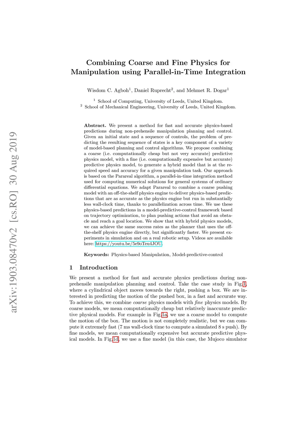 We present a method for fast and accurate physics-based predictions during non-prehensile manipulation planning and control. Given an initial state and a sequence of controls, the problem of predicting the resulting sequence of states is a key component of a variety of model-based planning and control algorithms. We propose combining a coarse (i.e. computationally cheap but not very accurate) predictive physics model, with a fine (i.e. computationally expensive but accurate) predictive physics model, to generate a hybrid model that is at the required speed and accuracy for a given manipulation task. Our approach is based on the Parareal algorithm, a parallel-in-time integration method used for computing numerical solutions for general systems of ordinary differential equations. We adapt Parareal to combine a coarse pushing model with an off-the-shelf physics engine to deliver physics-based predictions that are as accurate as the physics engine but run in substantially less wall-clock time, thanks to parallelization across time. We use these physics-based predictions in a model-predictive-control framework based on trajectory optimization, to plan pushing actions that avoid an obstacle and reach a goal location. We show that with hybrid physics models, we can achieve the same success rates as the planner that uses the off-the-shelf physics engine directly, but significantly faster. We present experiments in simulation and on a real robotic setup. Videos are available here: https://youtu.be/5e9oTeu4JOU