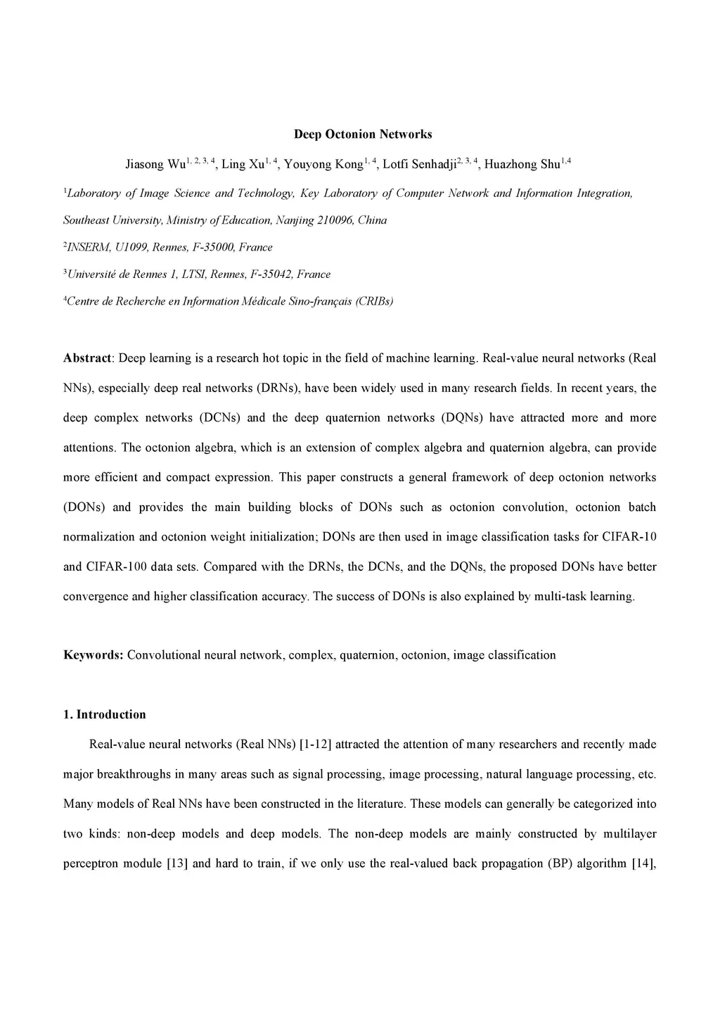 Deep learning is a research hot topic in the field of machine learning. Real-value neural networks (Real NNs), especially deep real networks (DRNs), have been widely used in many research fields. In recent years, the deep complex networks (DCNs) and the deep quaternion networks (DQNs) have attracted more and more attentions. The octonion algebra, which is an extension of complex algebra and quaternion algebra, can provide more efficient and compact expression. This paper constructs a general framework of deep octonion networks (DONs) and provides the main building blocks of DONs such as octonion convolution, octonion batch normalization and octonion weight initialization; DONs are then used in image classification tasks for CIFAR-10 and CIFAR-100 data sets. Compared with the DRNs, the DCNs, and the DQNs, the proposed DONs have better convergence and higher classification accuracy. The success of DONs is also explained by multi-task learning.