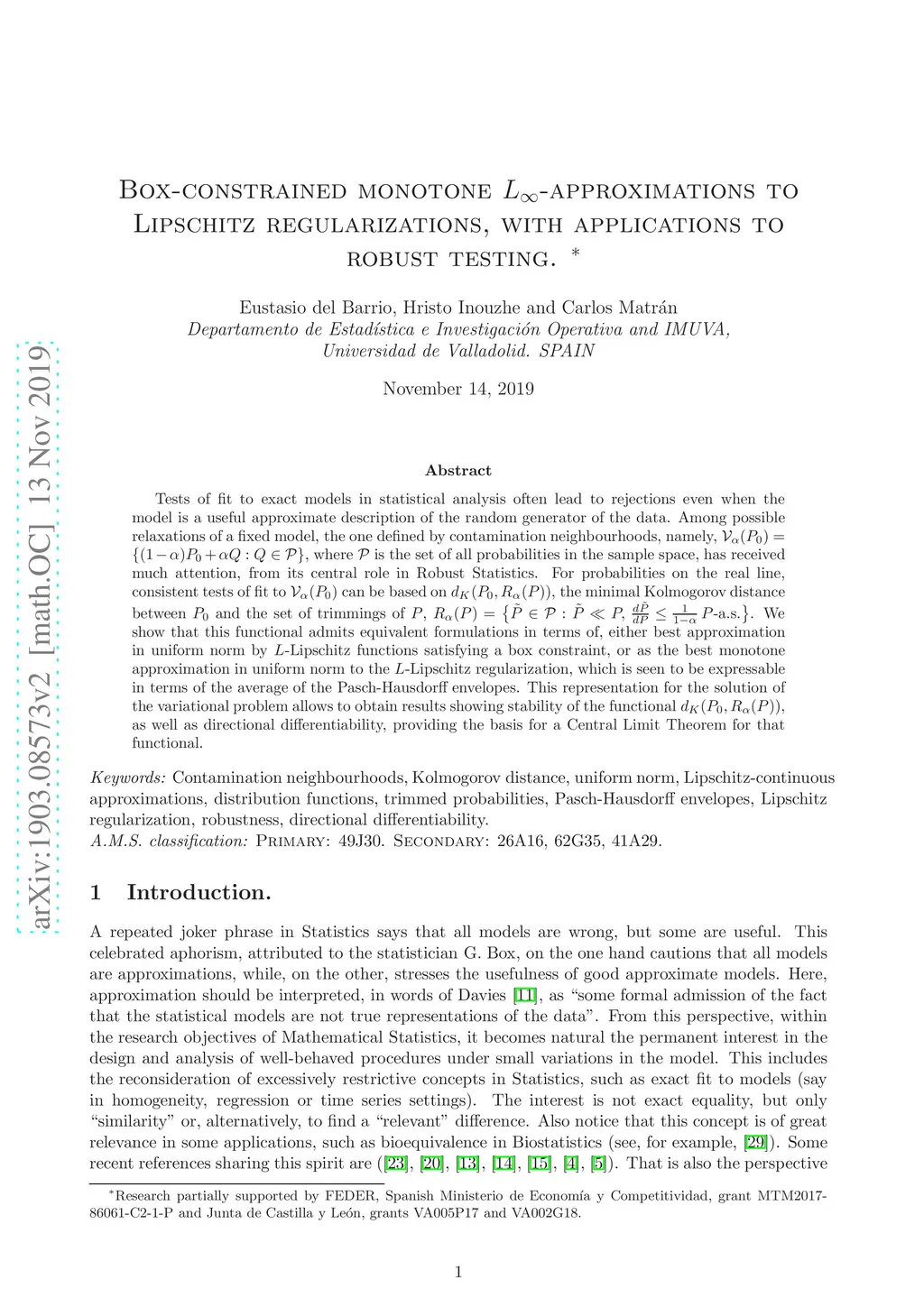 Tests of fit to exact models in statistical analysis often lead to rejections even when the model is a useful approximate description of the random generator of the data. Among possible relaxations of a fixed model, the one defined by contamination neighbourhoods, namely, , where is the set of all probabilities in the sample space, has received much attention, from its central role in Robust Statistics. For probabilities on the real line, consistent tests of fit to can be based on , the minimal Kolmogorov distance between and the set of trimmings of , . We show that this functional admits equivalent formulations in terms of, either best approximation in uniform norm by -Lipschitz functions satisfying a box constraint, or as the best monotone approximation in uniform norm to the -Lipschitz regularization, which is seen to be expressable in terms of the average of the Pasch-Hausdorff envelopes. This representation for the solution of the variational problem allows to obtain results showing stability of the functional , as well as directional differentiability, providing the basis for a Central Limit Theorem for that functional.