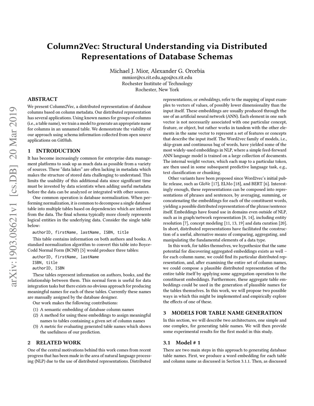 We present Column2Vec, a distributed representation of database columns based on column metadata. Our distributed representation has several applications. Using known names for groups of columns (i.e., a table name), we train a model to generate an appropriate name for columns in an unnamed table. We demonstrate the viability of our approach using schema information collected from open source applications on GitHub.