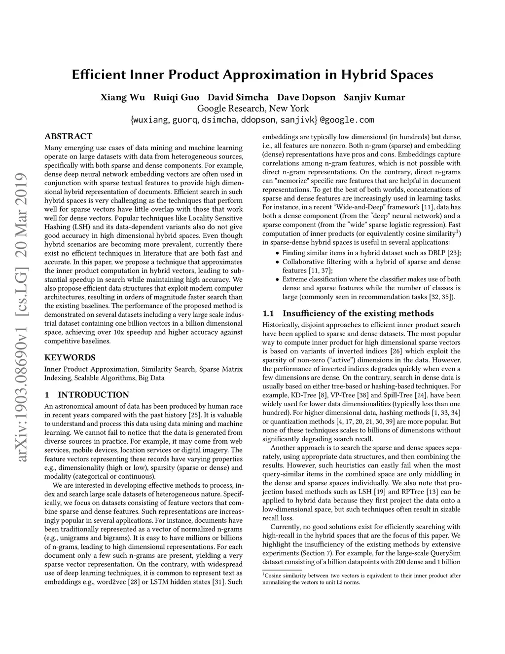 Many emerging use cases of data mining and machine learning operate on large datasets with data from heterogeneous sources, specifically with both sparse and dense components. For example, dense deep neural network embedding vectors are often used in conjunction with sparse textual features to provide high dimensional hybrid representation of documents. Efficient search in such hybrid spaces is very challenging as the techniques that perform well for sparse vectors have little overlap with those that work well for dense vectors. Popular techniques like Locality Sensitive Hashing (LSH) and its data-dependent variants also do not give good accuracy in high dimensional hybrid spaces. Even though hybrid scenarios are becoming more prevalent, currently there exist no efficient techniques in literature that are both fast and accurate. In this paper, we propose a technique that approximates the inner product computation in hybrid vectors, leading to substantial speedup in search while maintaining high accuracy. We also propose efficient data structures that exploit modern computer architectures, resulting in orders of magnitude faster search than the existing baselines. The performance of the proposed method is demonstrated on several datasets including a very large scale industrial dataset containing one billion vectors in a billion dimensional space, achieving over 10x speedup and higher accuracy against competitive baselines.