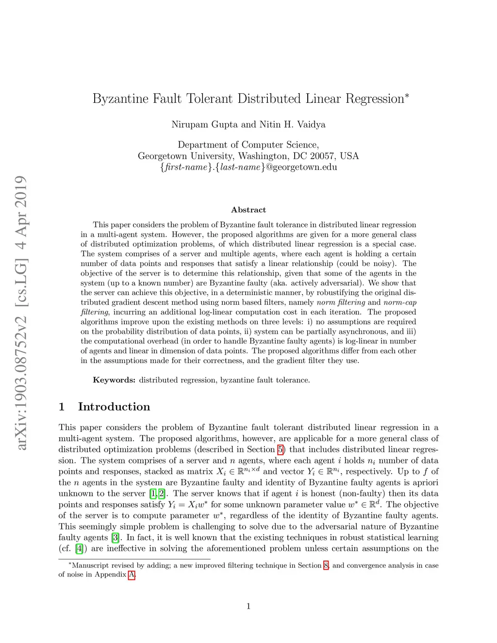 This paper considers the problem of Byzantine fault tolerant distributed linear regression. The system comprises of a server and number of agents, where each agent is holding some data points and responses. Up to of the agents in the system are Byzantine faulty and the identity of Byzantine faulty agents is apriori unknown to the server. The datasets and responses of honest agents are related linearly through a common parameter, which is to be determined by the server. This seemingly simple problem is challenging to solve due to the Byzantine (or adversarial) nature of faulty agents. We propose a simple norm filtering technique that "robustifies" the original distributed gradient descent algorithm to solve the aforementioned regression problem when is less than a specified threshold value. The computational complexity of the proposed filtering technique is and the resultant algorithm is shown to be partially asynchronous. Unlike existing algorithms for Byzantine fault tolerance in distributed statistical learning, the proposed algorithm does not rely on assumptions on the probability distribution of agents' data points. The proposed algorithm also solves a more general distributed multi-agent optimization problem under Byzantine faults.