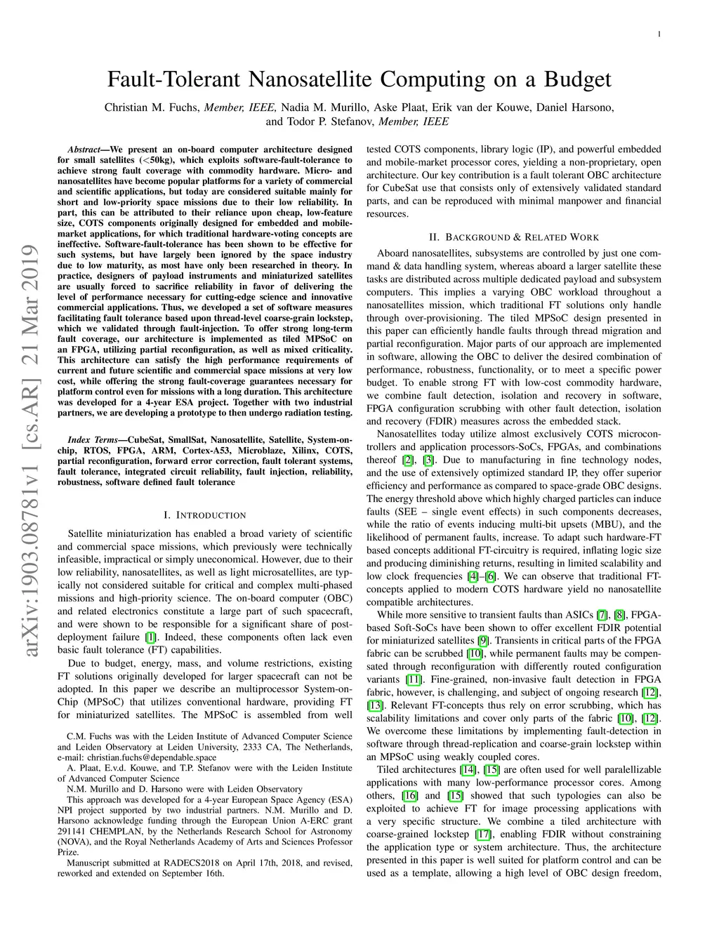 Micro- and nanosatellites have become popular platforms for a variety of commercial and scientific applications, but today are considered suitable mainly for short and low-priority space missions due to their low reliability. In part, this can be attributed to their reliance upon cheap, low-feature size, COTS components originally designed for embedded and mobile-market applications, for which traditional hardware-voting concepts are ineffective. Software-fault-tolerance concepts have been shown effective for such systems, but have largely been ignored by the space industry due to low maturity, as most have only been researched in theory. In practice, designers of payload instruments and miniaturized satellites are usually forced to sacrifice reliability in favor deliver the level of performance necessary for cutting-edge science and innovative commercial applications. Thus, we developed a software-fault-tolerance-approach based upon thread-level coarse-grain lockstep, which was validated using fault-injection. To offer strong long-term fault coverage, our architecture is implemented as tiled MPSoC on an FPGA, utilizing partial reconfiguration, as well as mixed criticality. This architecture can satisfy the high performance requirements of current and future scientific and commercial space missions at very low cost, while offering the strong fault-coverage guarantees necessary for platform control even for missions with a long duration. This architecture was developed for a 4-year ESA project. Together with two industrial partners, we are developing a prototype to then undergo radiation testing.