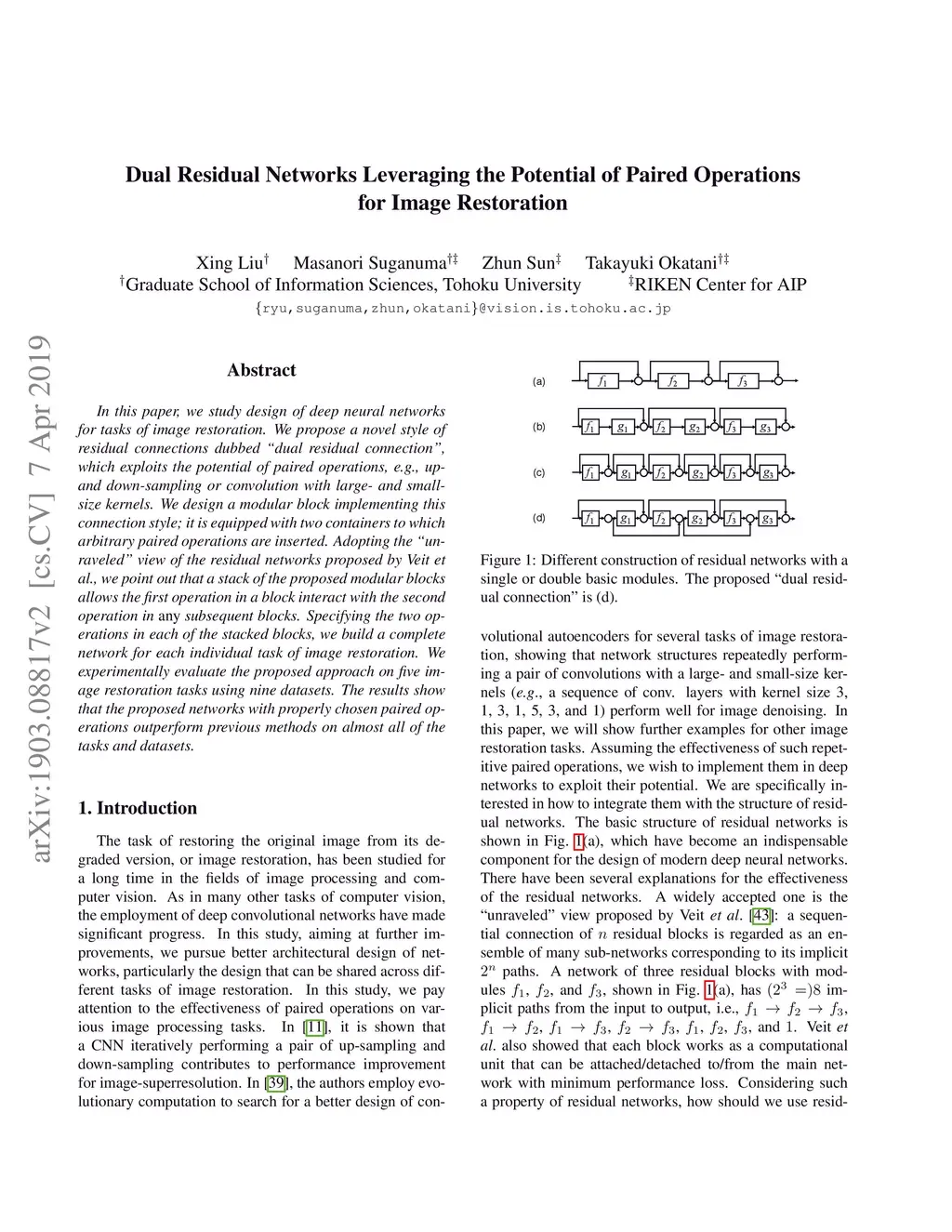 In this paper, we study design of deep neural networks for tasks of image restoration. We propose a novel style of residual connections dubbed "dual residual connection", which exploits the potential of paired operations, e.g., up- and down-sampling or convolution with large- and small-size kernels. We design a modular block implementing this connection style; it is equipped with two containers to which arbitrary paired operations are inserted. Adopting the "unraveled" view of the residual networks proposed by Veit et al., we point out that a stack of the proposed modular blocks allows the first operation in a block interact with the second operation in any subsequent blocks. Specifying the two operations in each of the stacked blocks, we build a complete network for each individual task of image restoration. We experimentally evaluate the proposed approach on five image restoration tasks using nine datasets. The results show that the proposed networks with properly chosen paired operations outperform previous methods on almost all of the tasks and datasets.