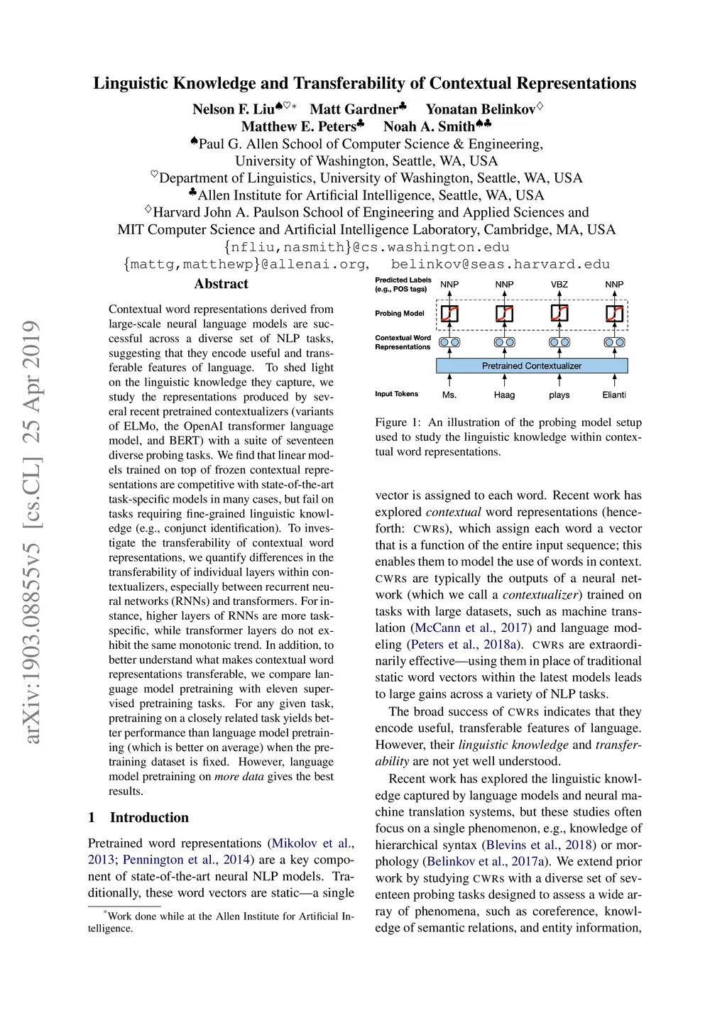 Contextual word representations derived from large-scale neural language models are successful across a diverse set of NLP tasks, suggesting that they encode useful and transferable features of language. To shed light on the linguistic knowledge they capture, we study the representations produced by several recent pretrained contextualizers (variants of ELMo, the OpenAI transformer language model, and BERT) with a suite of seventeen diverse probing tasks. We find that linear models trained on top of frozen contextual representations are competitive with state-of-the-art task-specific models in many cases, but fail on tasks requiring fine-grained linguistic knowledge (e.g., conjunct identification). To investigate the transferability of contextual word representations, we quantify differences in the transferability of individual layers within contextualizers, especially between recurrent neural networks (RNNs) and transformers. For instance, higher layers of RNNs are more task-specific, while transformer layers do not exhibit the same monotonic trend. In addition, to better understand what makes contextual word representations transferable, we compare language model pretraining with eleven supervised pretraining tasks. For any given task, pretraining on a closely related task yields better performance than language model pretraining (which is better on average) when the pretraining dataset is fixed. However, language model pretraining on more data gives the best results.