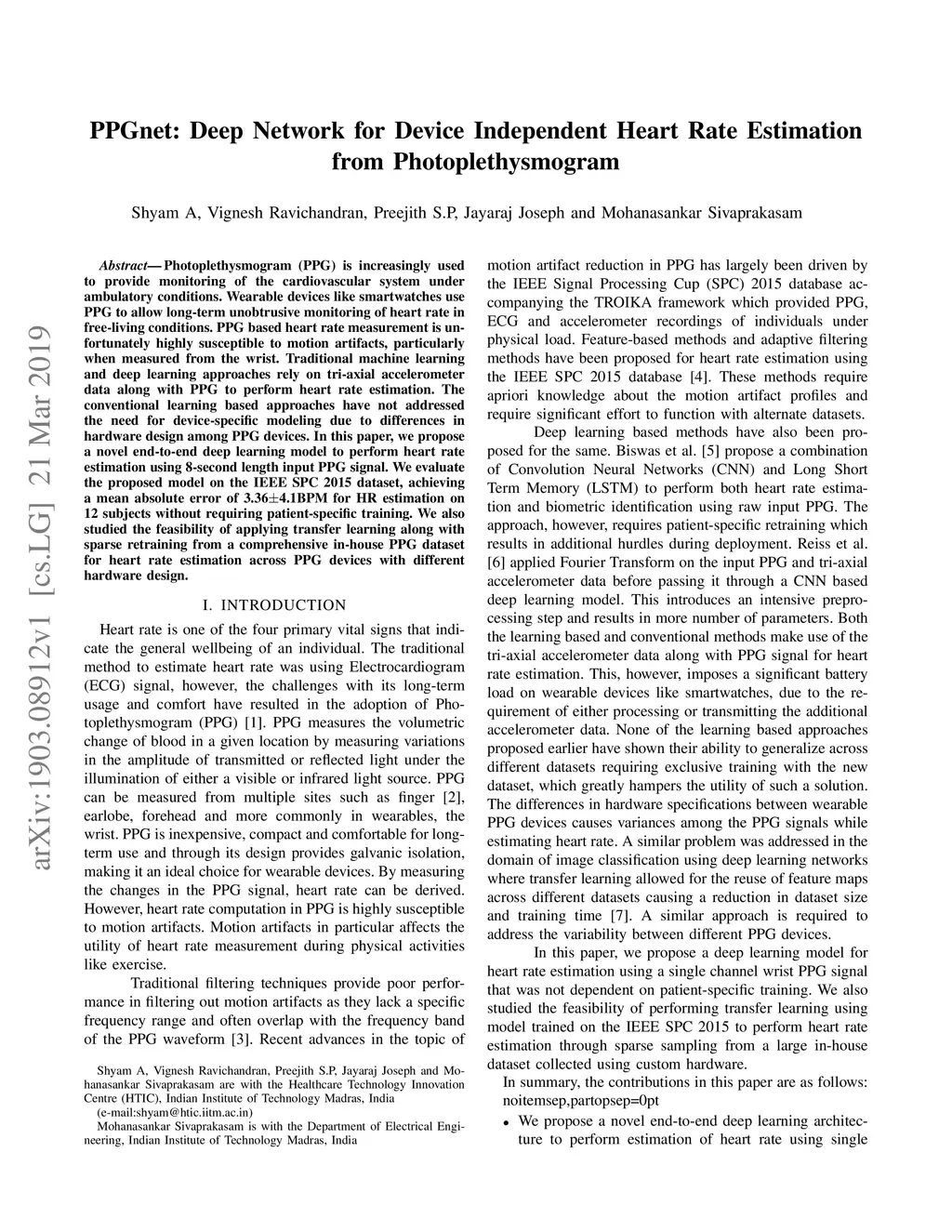 Photoplethysmogram (PPG) is increasingly used to provide monitoring of the cardiovascular system under ambulatory conditions. Wearable devices like smartwatches use PPG to allow long term unobtrusive monitoring of heart rate in free living conditions. PPG based heart rate measurement is unfortunately highly susceptible to motion artifacts, particularly when measured from the wrist. Traditional machine learning and deep learning approaches rely on tri-axial accelerometer data along with PPG to perform heart rate estimation. The conventional learning based approaches have not addressed the need for device-specific modeling due to differences in hardware design among PPG devices. In this paper, we propose a novel end to end deep learning model to perform heart rate estimation using 8 second length input PPG signal. We evaluate the proposed model on the IEEE SPC 2015 dataset, achieving a mean absolute error of 3.36+-4.1BPM for HR estimation on 12 subjects without requiring patient specific training. We also studied the feasibility of applying transfer learning along with sparse retraining from a comprehensive in house PPG dataset for heart rate estimation across PPG devices with different hardware design.