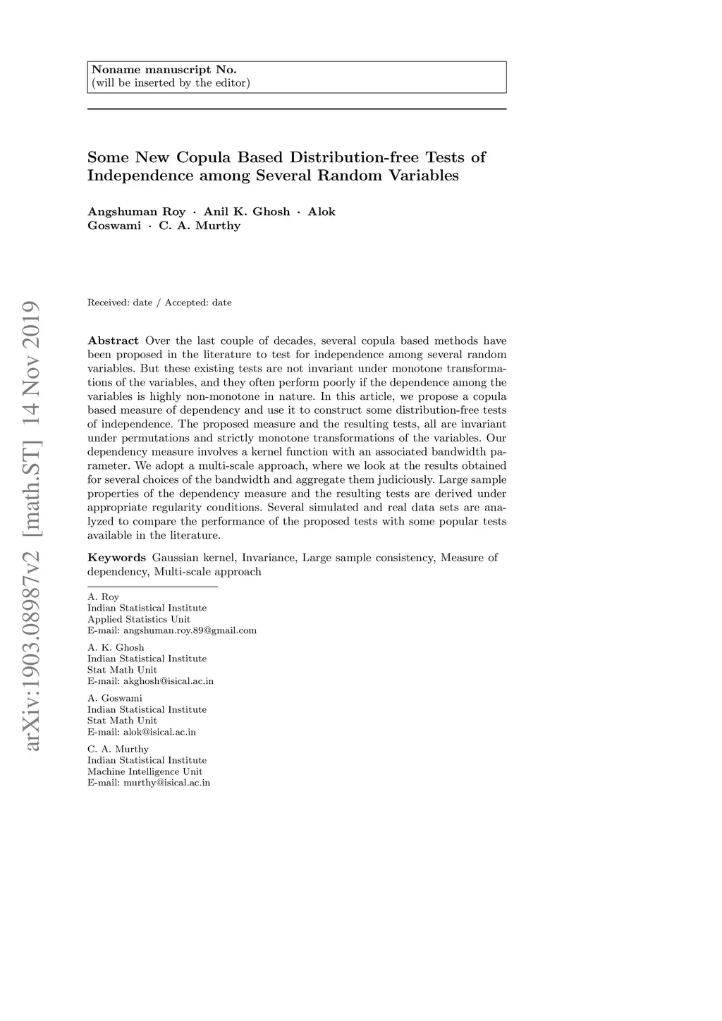 Over the last couple of decades, several copula based methods have been proposed in the literature to test for the independence among several random variables. But these existing tests are not invariant under monotone transformations of the variables, and they often perform poorly if the dependence among the variables is highly non-monotone in nature. In this article, we propose a copula based measure of dependency and use it to construct some new distribution-free tests of independence. The proposed measure and the resulting tests, all are invariant under permutations and monotone transformations of the variables. Our dependency measure involves a kernel function, and we use the Gaussian kernel for that purpose. We adopt a multi-scale approach, where we look at the results obtained for several choices of the bandwidth parameter associated with the Gaussian kernel and aggregate them judiciously. Large sample properties of the dependency measure and the resulting tests are derived under appropriate regularity conditions. Several simulated and real data sets are analyzed to compare the performance of the proposed tests with some popular tests available in the literature.