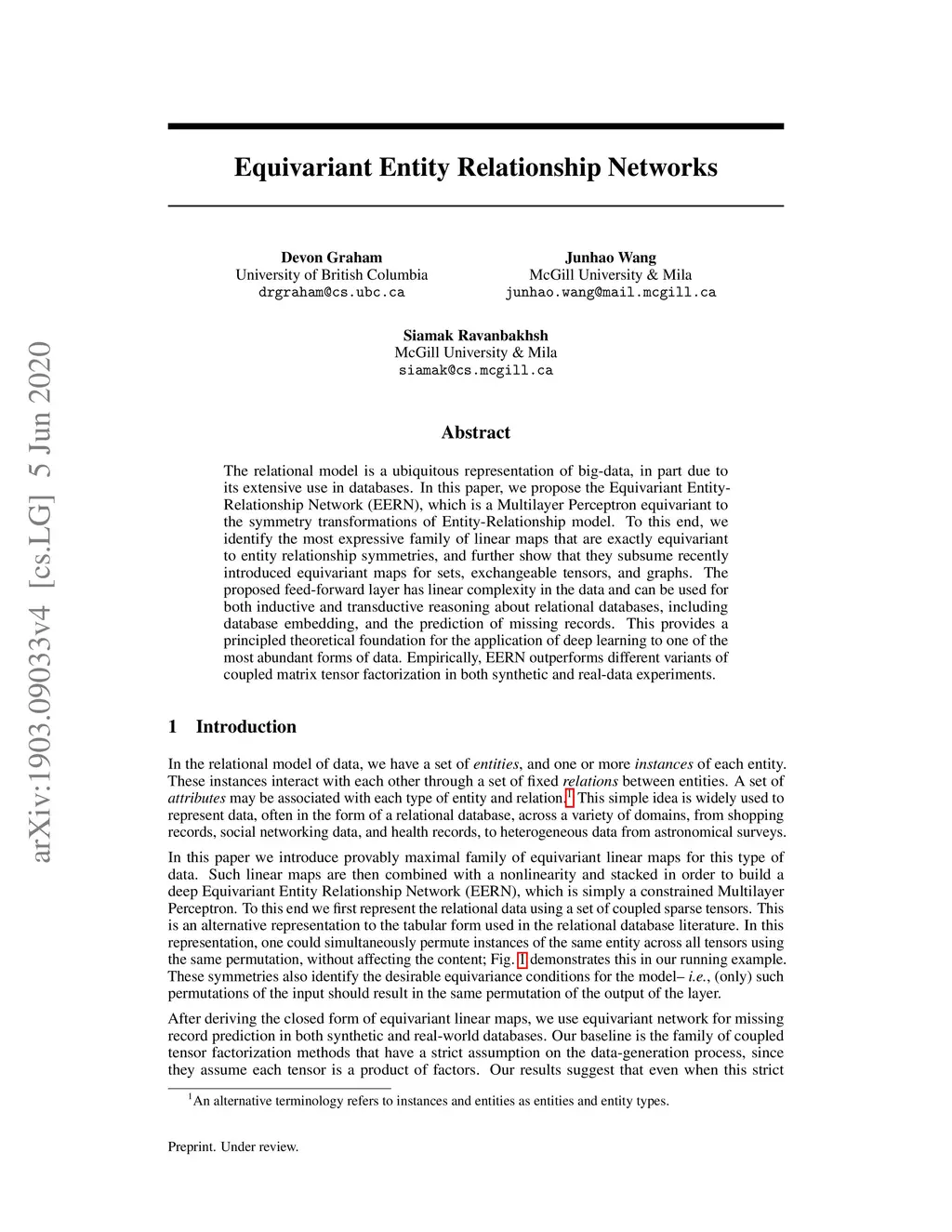 The relational model is a ubiquitous representation of big-data, in part due to its extensive use in databases. In this paper, we propose the Equivariant Entity-Relationship Network (EERN), which is a Multilayer Perceptron equivariant to the symmetry transformations of the Entity-Relationship model. To this end, we identify the most expressive family of linear maps that are exactly equivariant to entity relationship symmetries, and further show that they subsume recently introduced equivariant maps for sets, exchangeable tensors, and graphs. The proposed feed-forward layer has linear complexity in the data and can be used for both inductive and transductive reasoning about relational databases, including database embedding, and the prediction of missing records. This provides a principled theoretical foundation for the application of deep learning to one of the most abundant forms of data. Empirically, EERN outperforms different variants of coupled matrix tensor factorization in both synthetic and real-data experiments.