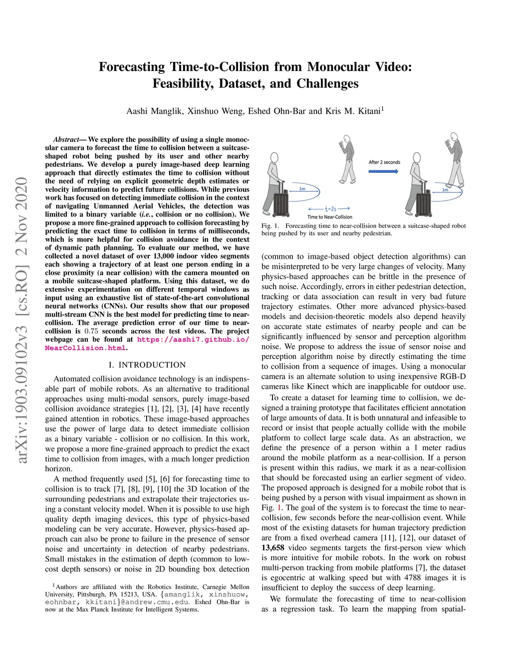 We explore the possibility of using a single monocular camera to forecast the time to collision between a suitcase-shaped robot being pushed by its user and other nearby pedestrians. We develop a purely image-based deep learning approach that directly estimates the time to collision without the need of relying on explicit geometric depth estimates or velocity information to predict future collisions. While previous work has focused on detecting immediate collision in the context of navigating Unmanned Aerial Vehicles, the detection was limited to a binary variable (i.e., collision or no collision). We propose a more fine-grained approach to collision forecasting by predicting the exact time to collision in terms of milliseconds, which is more helpful for collision avoidance in the context of dynamic path planning. To evaluate our method, we have collected a novel dataset of over 13,000 indoor video segments each showing a trajectory of at least one person ending in a close proximity (a near collision) with the camera mounted on a mobile suitcase-shaped platform. Using this dataset, we do extensive experimentation on different temporal windows as input using an exhaustive list of state-of-the-art convolutional neural networks (CNNs). Our results show that our proposed multi-stream CNN is the best model for predicting time to near-collision. The average prediction error of our time to near collision is 0.75 seconds across the test videos.