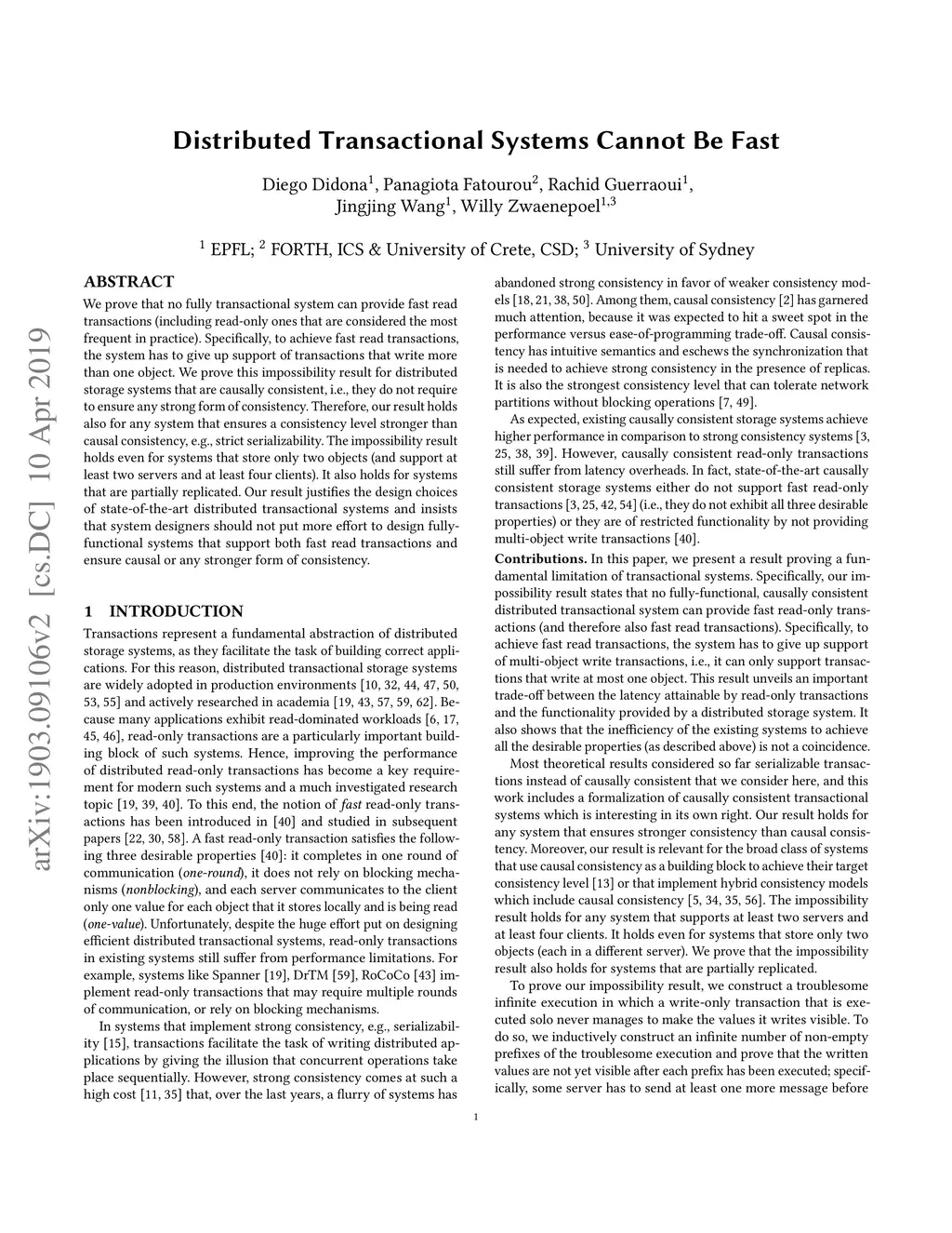 We prove that no fully transactional system can provide fast read transactions (including read-only ones that are considered the most frequent in practice). Specifically, to achieve fast read transactions, the system has to give up support of transactions that write more than one object. We prove this impossibility result for distributed storage systems that are causally consistent, i.e., they do not require to ensure any strong form of consistency. Therefore, our result holds also for any system that ensures a consistency level stronger than causal consistency, e.g., strict serializability. The impossibility result holds even for systems that store only two objects (and support at least two servers and at least four clients). It also holds for systems that are partially replicated. Our result justifies the design choices of state-of-the-art distributed transactional systems and insists that system designers should not put more effort to design fully-functional systems that support both fast read transactions and ensure causal or any stronger form of consistency.