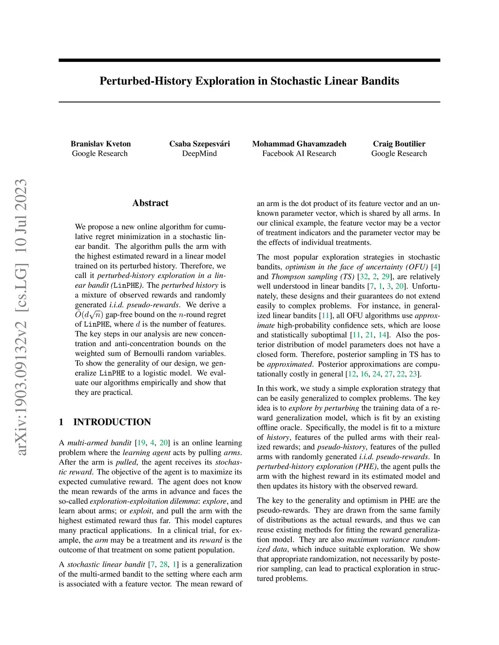 Perturbed-History Exploration in Stochastic Linear Bandits