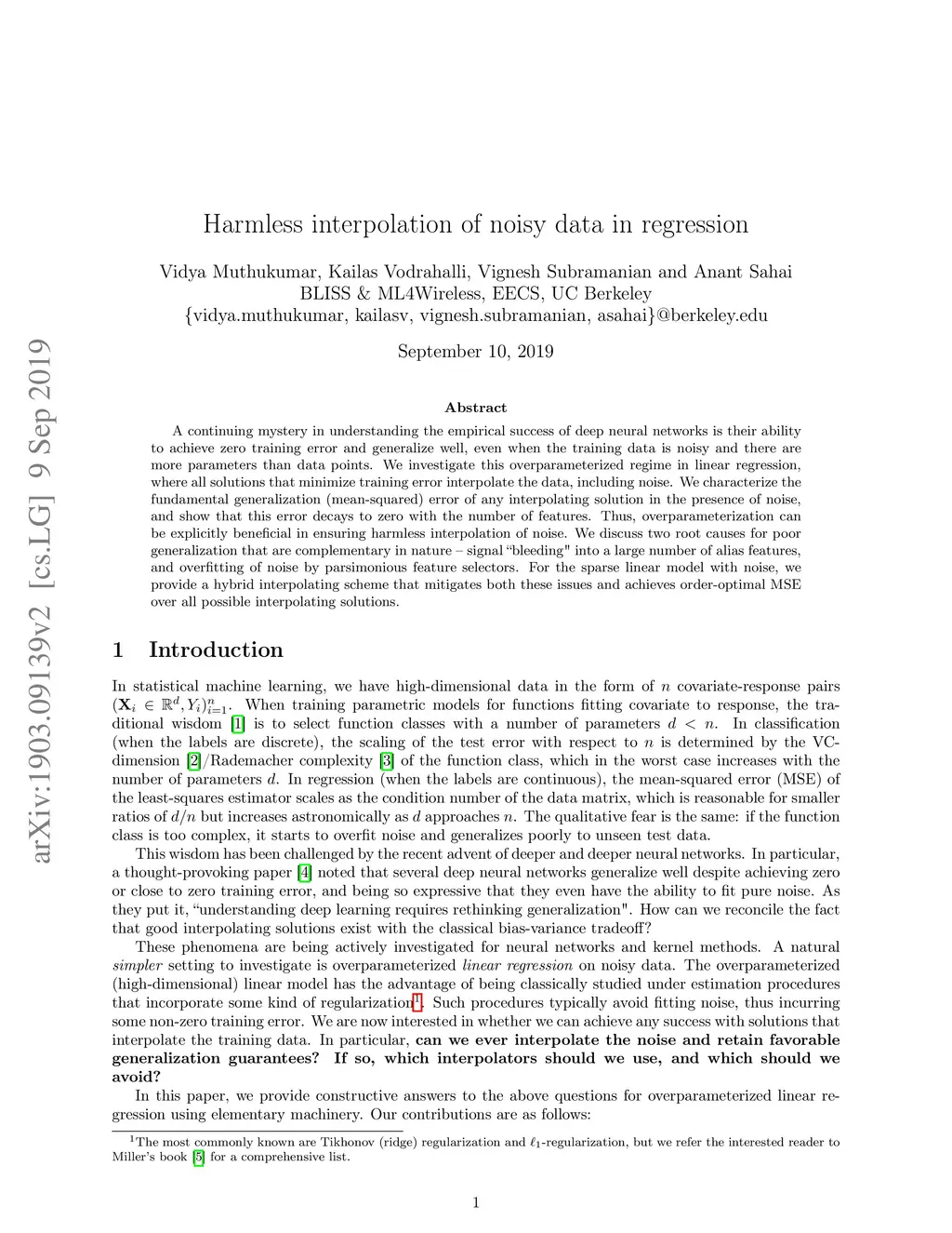 A continuing mystery in understanding the empirical success of deep neural networks is their ability to achieve zero training error and generalize well, even when the training data is noisy and there are more parameters than data points. We investigate this overparameterized regime in linear regression, where all solutions that minimize training error interpolate the data, including noise. We characterize the fundamental generalization (mean-squared) error of any interpolating solution in the presence of noise, and show that this error decays to zero with the number of features. Thus, overparameterization can be explicitly beneficial in ensuring harmless interpolation of noise. We discuss two root causes for poor generalization that are complementary in nature -- signal "bleeding" into a large number of alias features, and overfitting of noise by parsimonious feature selectors. For the sparse linear model with noise, we provide a hybrid interpolating scheme that mitigates both these issues and achieves order-optimal MSE over all possible interpolating solutions.