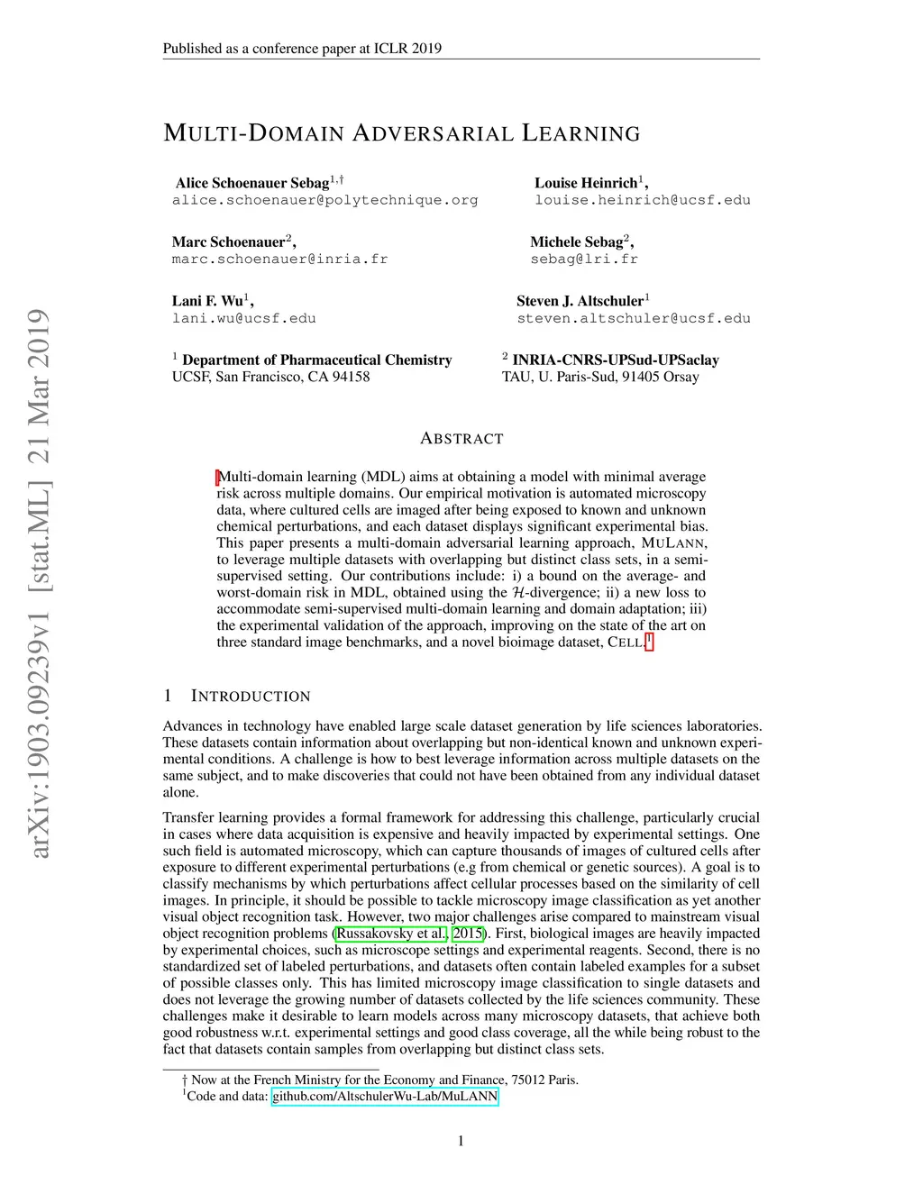 Multi-domain learning (MDL) aims at obtaining a model with minimal average risk across multiple domains. Our empirical motivation is automated microscopy data, where cultured cells are imaged after being exposed to known and unknown chemical perturbations, and each dataset displays significant experimental bias. This paper presents a multi-domain adversarial learning approach, MuLANN, to leverage multiple datasets with overlapping but distinct class sets, in a semi-supervised setting. Our contributions include: i) a bound on the average- and worst-domain risk in MDL, obtained using the H-divergence; ii) a new loss to accommodate semi-supervised multi-domain learning and domain adaptation; iii) the experimental validation of the approach, improving on the state of the art on two standard image benchmarks, and a novel bioimage dataset, Cell.