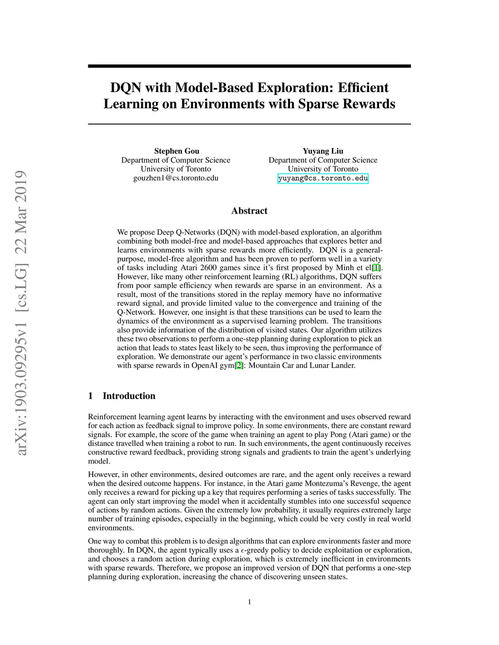DQN with model-based exploration: efficient learning on environments