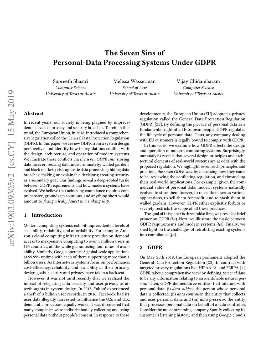 In recent years, our society is being plagued by unprecedented levels of privacy and security breaches. To rein in this trend, the European Union, in 2018, introduced a comprehensive legislation called the General Data Protection Regulation (GDPR). In this paper, we review GDPR from a system design perspective, and identify how its regulations conflict with the design, architecture, and operation of modern systems. We illustrate these conflicts via the seven GDPR sins: storing data forever; reusing data indiscriminately; walled gardens and black markets; risk-agnostic data processing; hiding data breaches; making unexplainable decisions; treating security as a secondary goal. Our findings reveal a deep-rooted tussle between GDPR requirements and how modern systems have evolved. We believe that achieving compliance requires comprehensive, grounds up solutions, and anything short would amount to fixing a leaky faucet in a sinking ship.