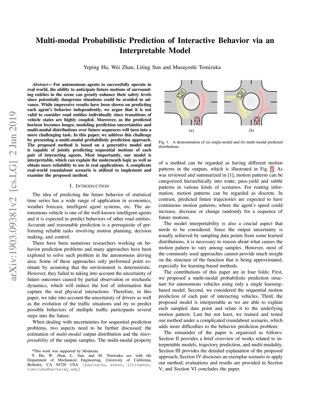For autonomous agents to successfully operate in real world, the ability to anticipate future motions of surrounding entities in the scene can greatly enhance their safety levels since potentially dangerous situations could be avoided in advance. While impressive results have been shown on predicting each agent's behavior independently, we argue that it is not valid to consider road entities individually since transitions of vehicle states are highly coupled. Moreover, as the predicted horizon becomes longer, modeling prediction uncertainties and multi-modal distributions over future sequences will turn into a more challenging task. In this paper, we address this challenge by presenting a multi-modal probabilistic prediction approach. The proposed method is based on a generative model and is capable of jointly predicting sequential motions of each pair of interacting agents. Most importantly, our model is interpretable, which can explain the underneath logic as well as obtain more reliability to use in real applications. A complicate real-world roundabout scenario is utilized to implement and examine the proposed method.
