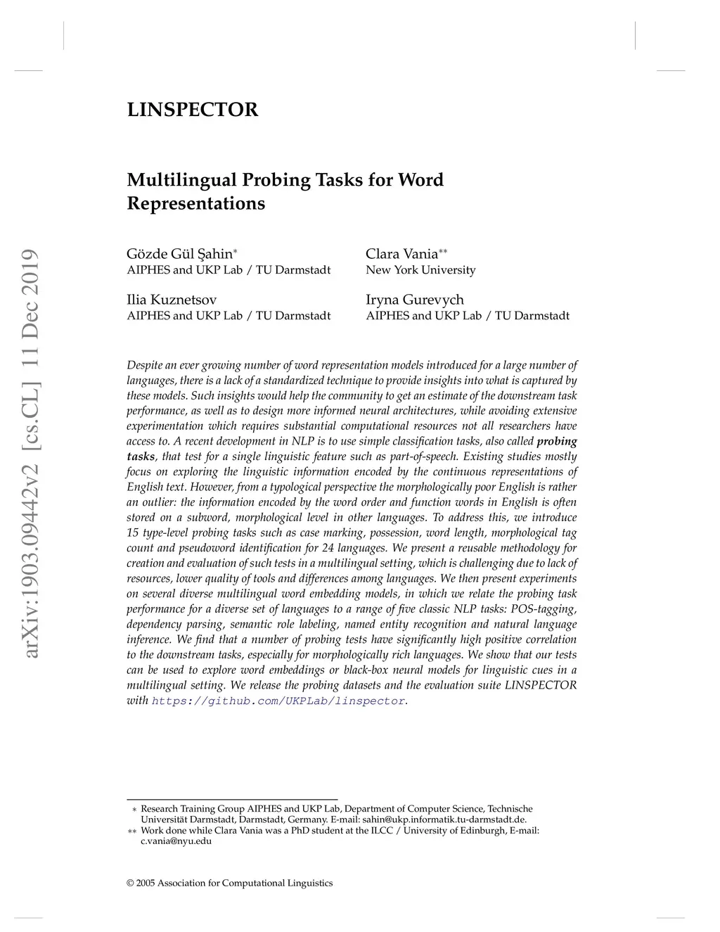 LINSPECTOR: Multilingual Probing Tasks for Word Representations