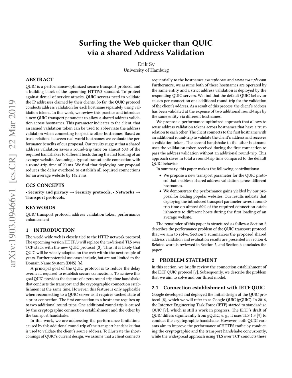 QUIC is a performance-optimized secure transport protocol and a building block of the upcoming HTTP/3 standard. To protect against denial-of-service attacks, QUIC servers need to validate the IP addresses claimed by their clients. So far, the QUIC protocol conducts address validation for each hostname separately using validation tokens. In this work, we review this practice and introduce a new QUIC transport parameter to allow a shared address validation across hostnames. This parameter indicates to the client, that an issued validation token can be used to abbreviate the address validation when connecting to specific other hostnames. Based on trust-relations between real-world hostnames we evaluate the performance benefits of our proposal. Our results suggest that a shared address validation saves a round-trip time on almost 60% of the required handshakes to different hosts during the first loading of an average website. Assuming a typical transatlantic connection with a round-trip time of 90ms. We find that deploying our proposal reduces the delay overhead to establish all required connections for an average website by 142.2ms.