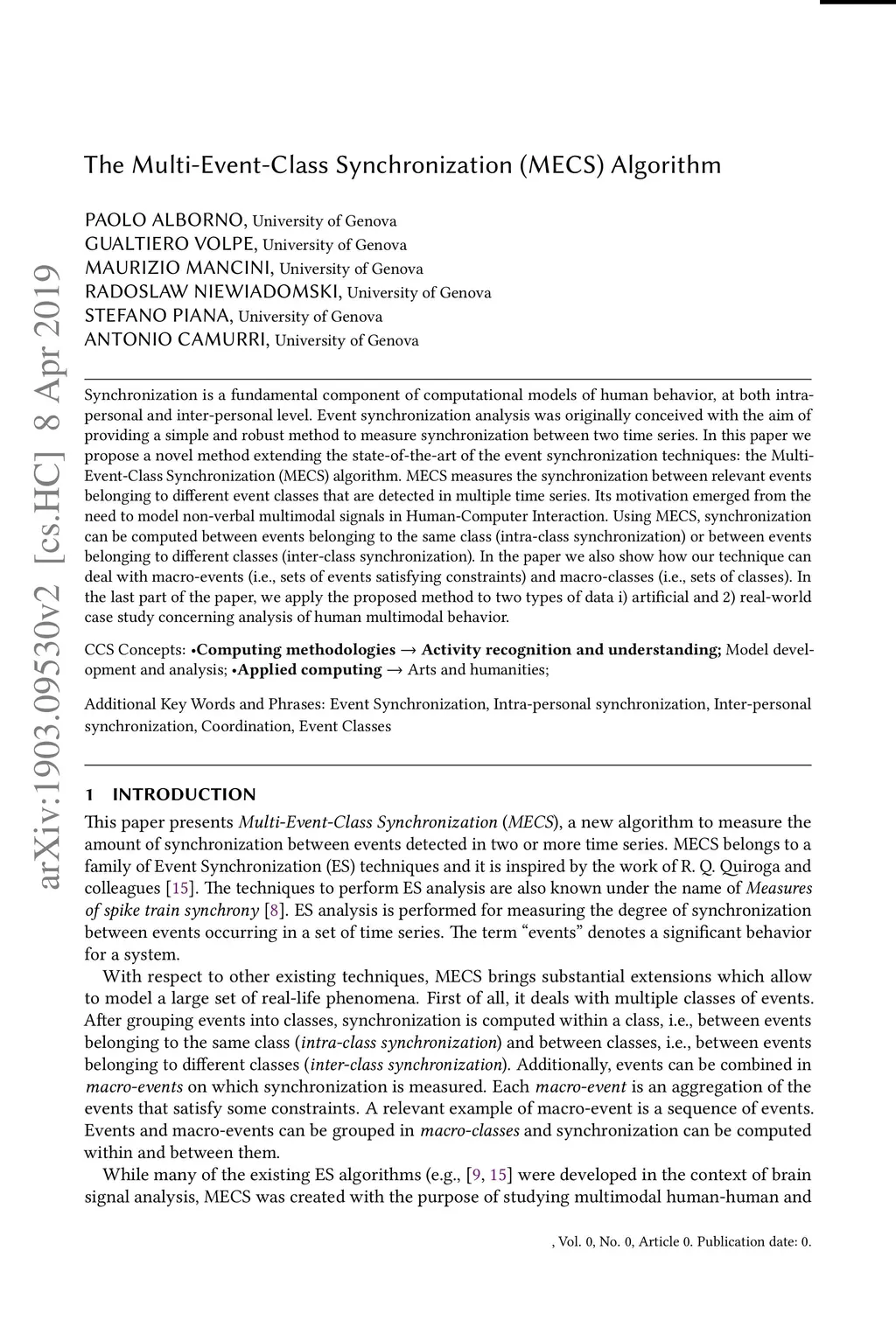 Synchronization is a fundamental component of computational models of human behavior, at both intra-personal and inter-personal level. Event synchronization analysis was originally conceived with the aim of providing a simple and robust method to measure synchronization between two time series. In this paper we propose a novel method extending the state-of-the-art of the event synchronization techniques: the Multi-Event-Class Synchronization (MECS) algorithm. MECS measures the synchronization between relevant events belonging to different event classes that are detected in multiple time series. Its motivation emerged from the need to model non-verbal multimodal signals in Human-Computer Interaction. Using MECS, synchronization can be computed between events belonging to the same class (intra-class synchronization) or between events belonging to different classes (inter-class synchronization). In the paper we also show how our technique can deal with macro-events (i.e., sets of events satisfying constraints) and macro-classes (i.e., sets of classes). In the last part of the paper, we apply the proposed method to two types of data i) artificial and 2) real-world case study concerning analysis of human multimodal behavior.