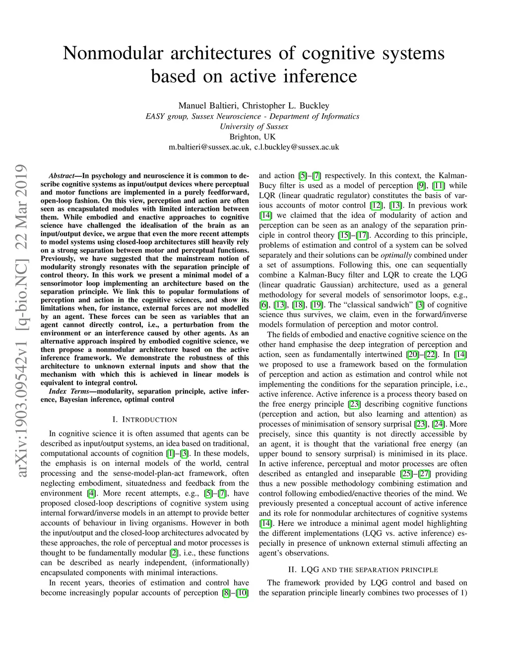 In psychology and neuroscience it is common to describe cognitive systems as input/output devices where perceptual and motor functions are implemented in a purely feedforward, open-loop fashion. On this view, perception and action are often seen as encapsulated modules with limited interaction between them. While embodied and enactive approaches to cognitive science have challenged the idealisation of the brain as an input/output device, we argue that even the more recent attempts to model systems using closed-loop architectures still heavily rely on a strong separation between motor and perceptual functions. Previously, we have suggested that the mainstream notion of modularity strongly resonates with the separation principle of control theory. In this work we present a minimal model of a sensorimotor loop implementing an architecture based on the separation principle. We link this to popular formulations of perception and action in the cognitive sciences, and show its limitations when, for instance, external forces are not modelled by an agent. These forces can be seen as variables that an agent cannot directly control, i.e., a perturbation from the environment or an interference caused by other agents. As an alternative approach inspired by embodied cognitive science, we then propose a nonmodular architecture based on the active inference framework. We demonstrate the robustness of this architecture to unknown external inputs and show that the mechanism with which this is achieved in linear models is equivalent to integral control.
