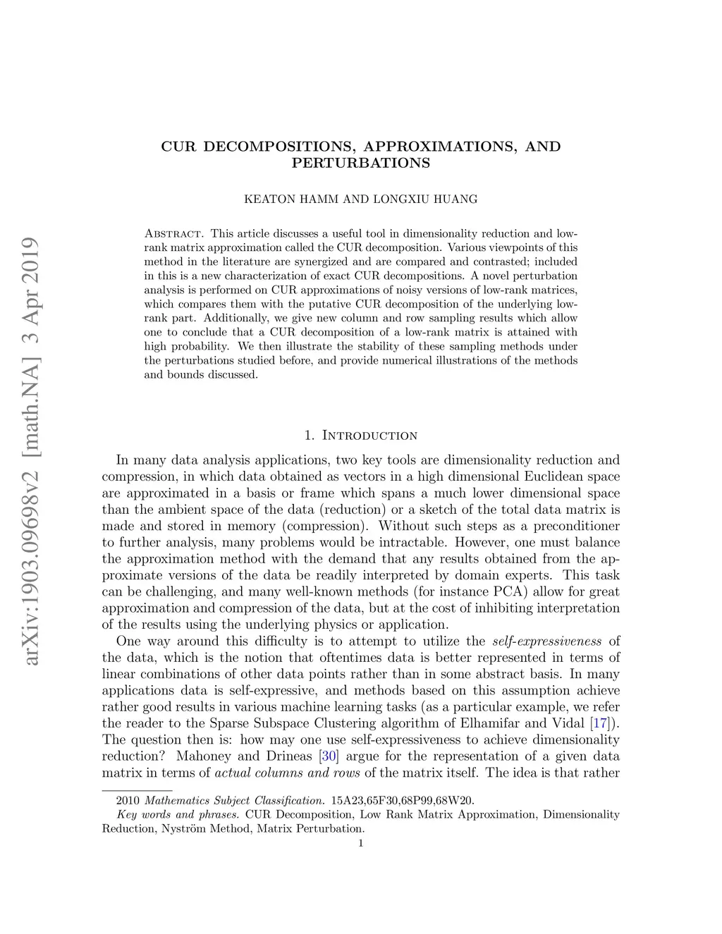 This article discusses a useful tool in dimensionality reduction and low-rank matrix approximation called the CUR decomposition. Various viewpoints of this method in the literature are synergized and are compared and contrasted; included in this is a new characterization of exact CUR decompositions. A novel perturbation analysis is performed on CUR approximations of noisy versions of low-rank matrices, which compares them with the putative CUR decomposition of the underlying low-rank part. Additionally, we give new column and row sampling results which allow one to conclude that a CUR decomposition of a low-rank matrix is attained with high probability. We then illustrate the stability of these sampling methods under the perturbations studied before, and provide numerical illustrations of the methods and bounds discussed.