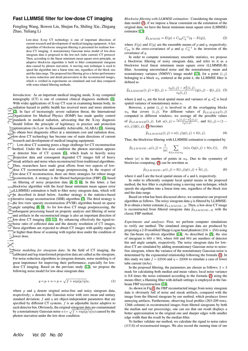 Low-dose X-ray CT technology is one of important directions of current research and development of medical imaging equipment. A fast algorithm of blockwise sinogram filtering is presented for realtime low-dose CT imaging. A nonstationary Gaussian noise model of low-dose sinogram data is proposed in the low-mA (tube current) CT protocol. Then, according to the linear minimum mean square error principle, an adaptive blockwise algorithm is built to filter contaminated sinogram data caused by photon starvation. A moving sum technique is used to speed the algorithm into a linear time one, regardless of the block size and thedata range. The proposedfast filtering givesa better performance in noise reduction and detail preservation in the reconstructed images,which is verified in experiments on simulated and real data compared with some related filtering methods.