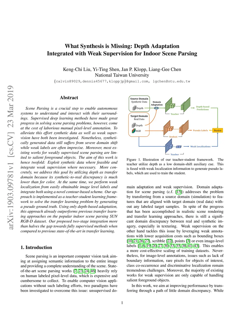 Scene Parsing is a crucial step to enable autonomous systems to understand and interact with their surroundings. Supervised deep learning methods have made great progress in solving scene parsing problems, however, come at the cost of laborious manual pixel-level annotation. To alleviate this effort synthetic data as well as weak supervision have both been investigated. Nonetheless, synthetically generated data still suffers from severe domain shift while weak labels are often imprecise. Moreover, most existing works for weakly supervised scene parsing are limited to salient foreground objects. The aim of this work is hence twofold: Exploit synthetic data where feasible and integrate weak supervision where necessary. More concretely, we address this goal by utilizing depth as transfer domain because its synthetic-to-real discrepancy is much lower than for color. At the same time, we perform weak localization from easily obtainable image level labels and integrate both using a novel contour-based scheme. Our approach is implemented as a teacher-student learning framework to solve the transfer learning problem by generating a pseudo ground truth. Using only depth-based adaptation, this approach already outperforms previous transfer learning approaches on the popular indoor scene parsing SUN RGB-D dataset. Our proposed two-stage integration more than halves the gap towards fully supervised methods when compared to previous state-of-the-art in transfer learning.