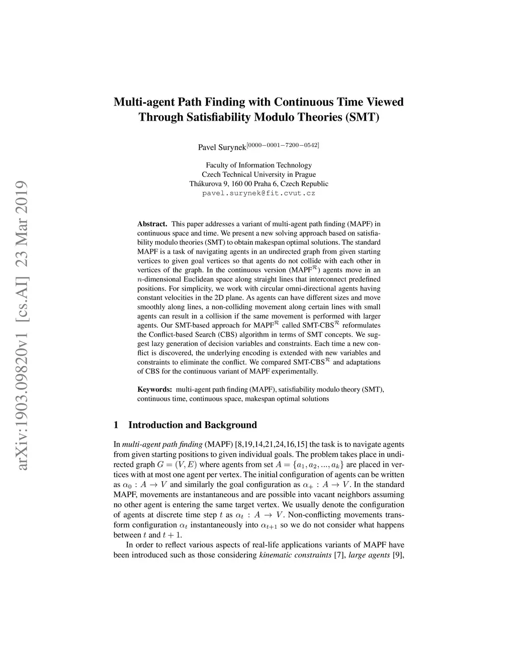 This paper addresses a variant of multi-agent path finding (MAPF) in continuous space and time. We present a new solving approach based on satisfiability modulo theories (SMT) to obtain makespan optimal solutions. The standard MAPF is a task of navigating agents in an undirected graph from given starting vertices to given goal vertices so that agents do not collide with each other in vertices of the graph. In the continuous version (MAPF) agents move in an -dimensional Euclidean space along straight lines that interconnect predefined positions. For simplicity, we work with circular omni-directional agents having constant velocities in the 2D plane. As agents can have different sizes and move smoothly along lines, a non-colliding movement along certain lines with small agents can result in a collision if the same movement is performed with larger agents. Our SMT-based approach for MAPF called SMT-CBS reformulates the Conflict-based Search (CBS) algorithm in terms of SMT concepts. We suggest lazy generation of decision variables and constraints. Each time a new conflict is discovered, the underlying encoding is extended with new variables and constraints to eliminate the conflict. We compared SMT-CBS and adaptations of CBS for the continuous variant of MAPF experimentally.