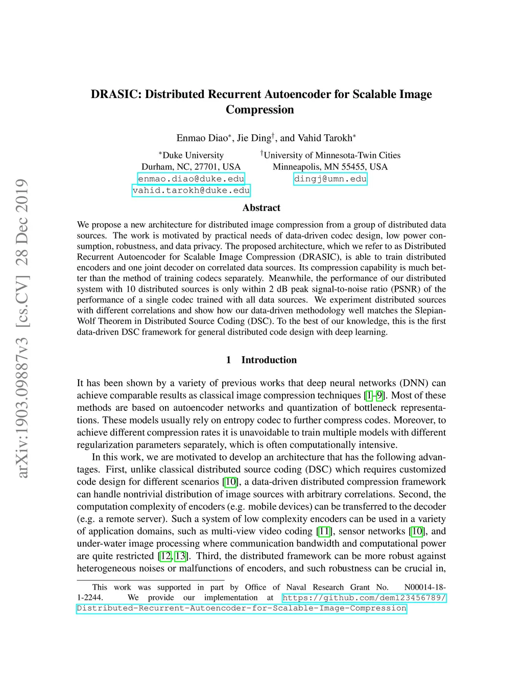 DRASIC: Distributed Recurrent Autoencoder for Scalable Image Compression