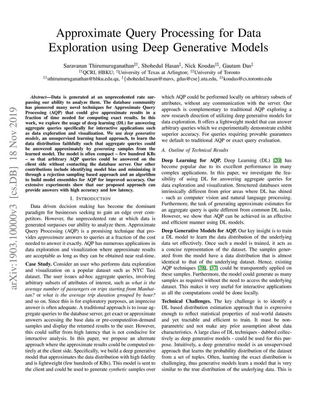 Data is generated at an unprecedented rate surpassing our ability to analyze them. The database community has pioneered many novel techniques for Approximate Query Processing (AQP) that could give approximate results in a fraction of time needed for computing exact results. In this work, we explore the usage of deep learning (DL) for answering aggregate queries specifically for interactive applications such as data exploration and visualization. We use deep generative models, an unsupervised learning based approach, to learn the data distribution faithfully such that aggregate queries could be answered approximately by generating samples from the learned model. The model is often compact - few hundred KBs - so that arbitrary AQP queries could be answered on the client side without contacting the database server. Our other contributions include identifying model bias and minimizing it through a rejection sampling based approach and an algorithm to build model ensembles for AQP for improved accuracy. Our extensive experiments show that our proposed approach can provide answers with high accuracy and low latency.
