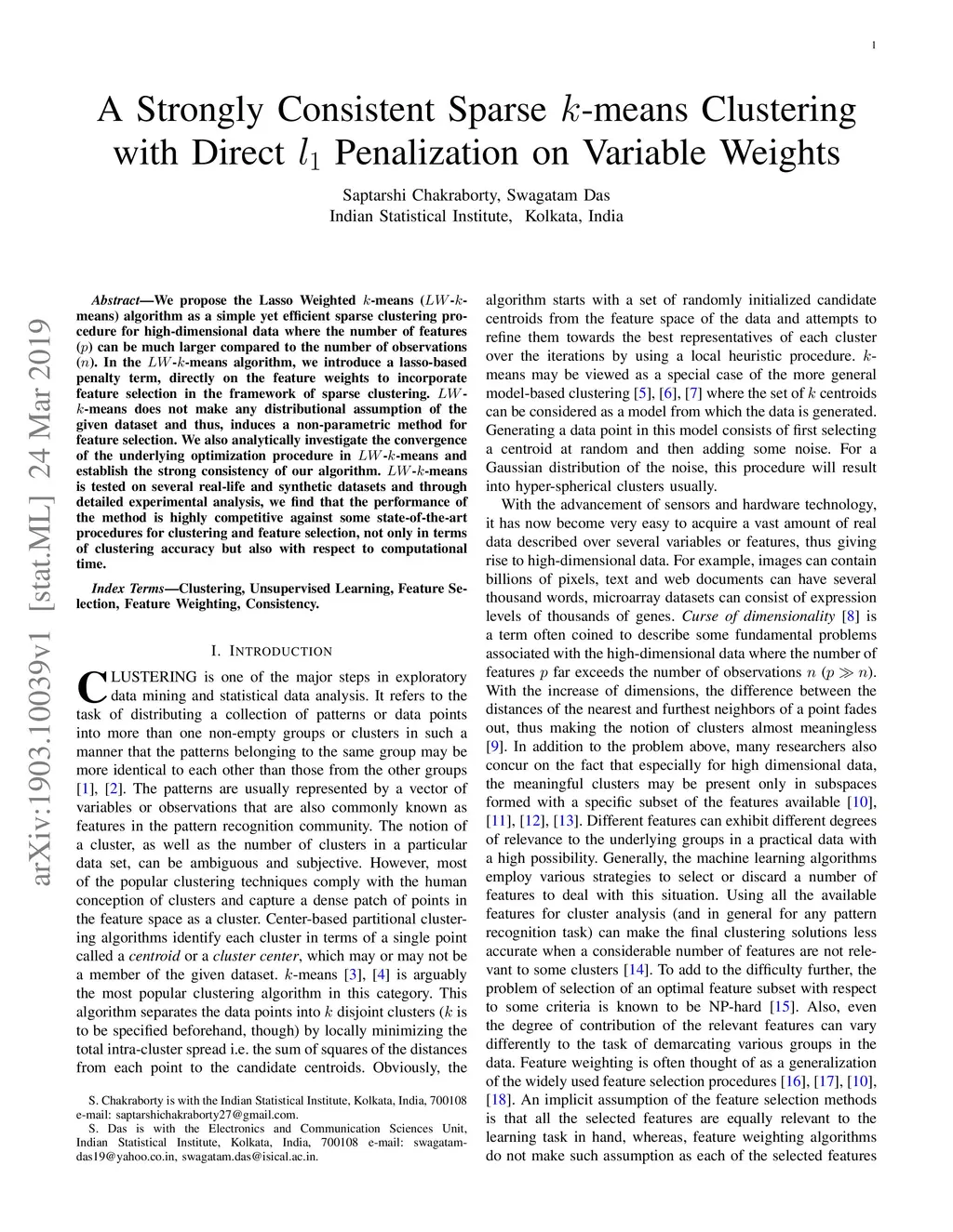We propose the Lasso Weighted -means (--means) algorithm as a simple yet efficient sparse clustering procedure for high-dimensional data where the number of features () can be much larger compared to the number of observations (). In the --means algorithm, we introduce a lasso-based penalty term, directly on the feature weights to incorporate feature selection in the framework of sparse clustering. --means does not make any distributional assumption of the given dataset and thus, induces a non-parametric method for feature selection. We also analytically investigate the convergence of the underlying optimization procedure in --means and establish the strong consistency of our algorithm. --means is tested on several real-life and synthetic datasets and through detailed experimental analysis, we find that the performance of the method is highly competitive against some state-of-the-art procedures for clustering and feature selection, not only in terms of clustering accuracy but also with respect to computational time.