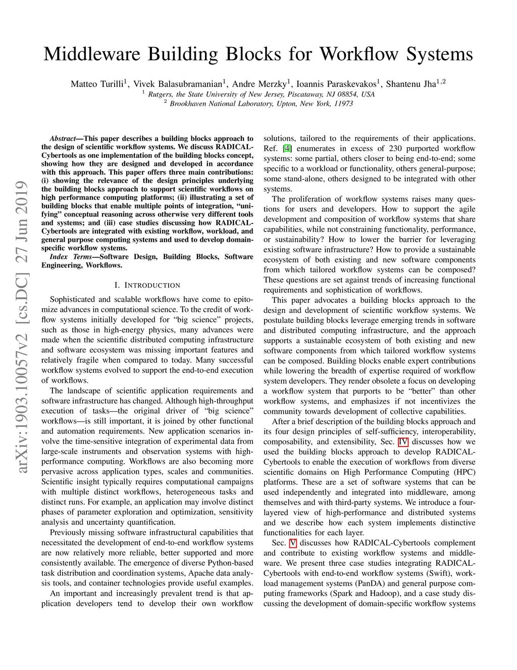 This paper describes a building blocks approach to the design of scientific workflow systems. We discuss RADICAL-Cybertools as one implementation of the building blocks concept, showing how they are designed and developed in accordance with this approach. This paper offers three main contributions: (i) showing the relevance of the design principles underlying the building blocks approach to support scientific workflows on high performance computing platforms; (ii) illustrating a set of building blocks that enable multiple points of integration, "unifying" conceptual reasoning across otherwise very different tools and systems; and (iii) case studies discussing how RADICAL-Cybertools are integrated with existing workflow, workload, and general purpose computing systems and used to develop domain-specific workflow systems.