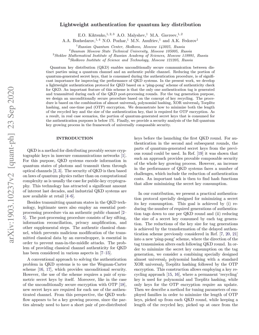 Lightweight authentication for quantum key distribution